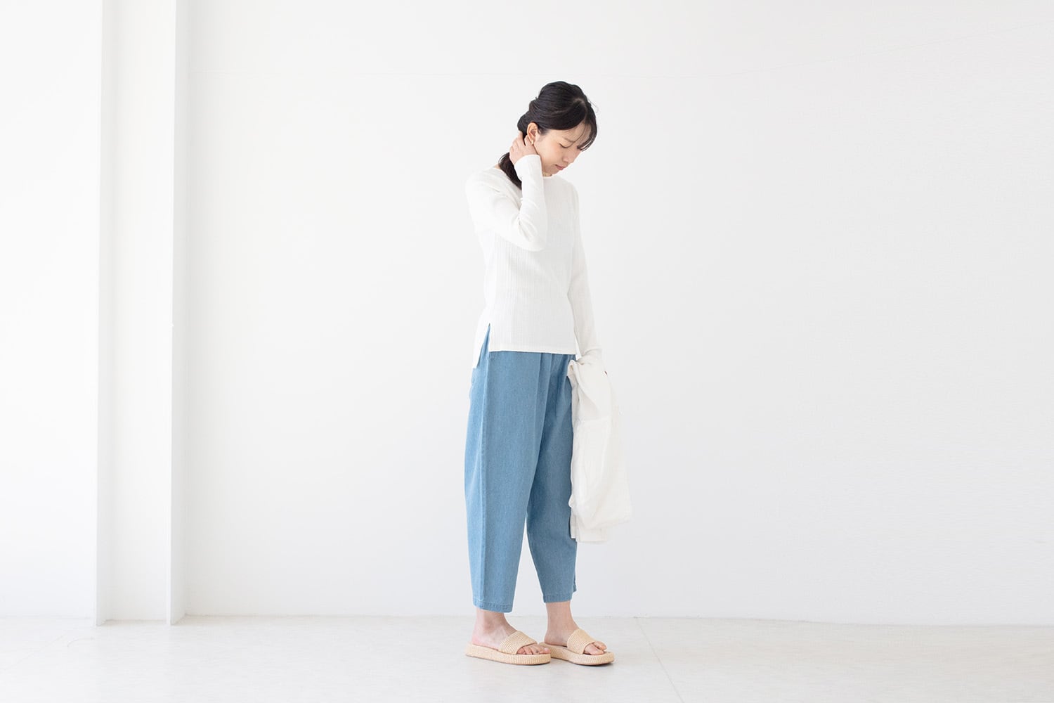 肩幅を内側に入れ込んで、袖を長く見せてくれるマジックのようなデザインの一枚で、シンプルなアイテムながらも1枚でさまになり、さまざまなスタイリングで活躍してくれる万能なトップスです。