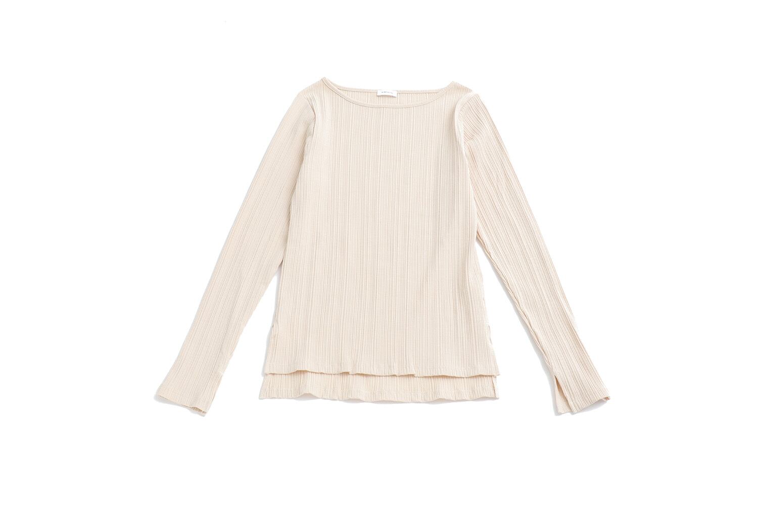 透けないしっかりとした生地感に柔軟性のあるキックバックが魅力のランダムリブを使用したボートネック長袖TEE。