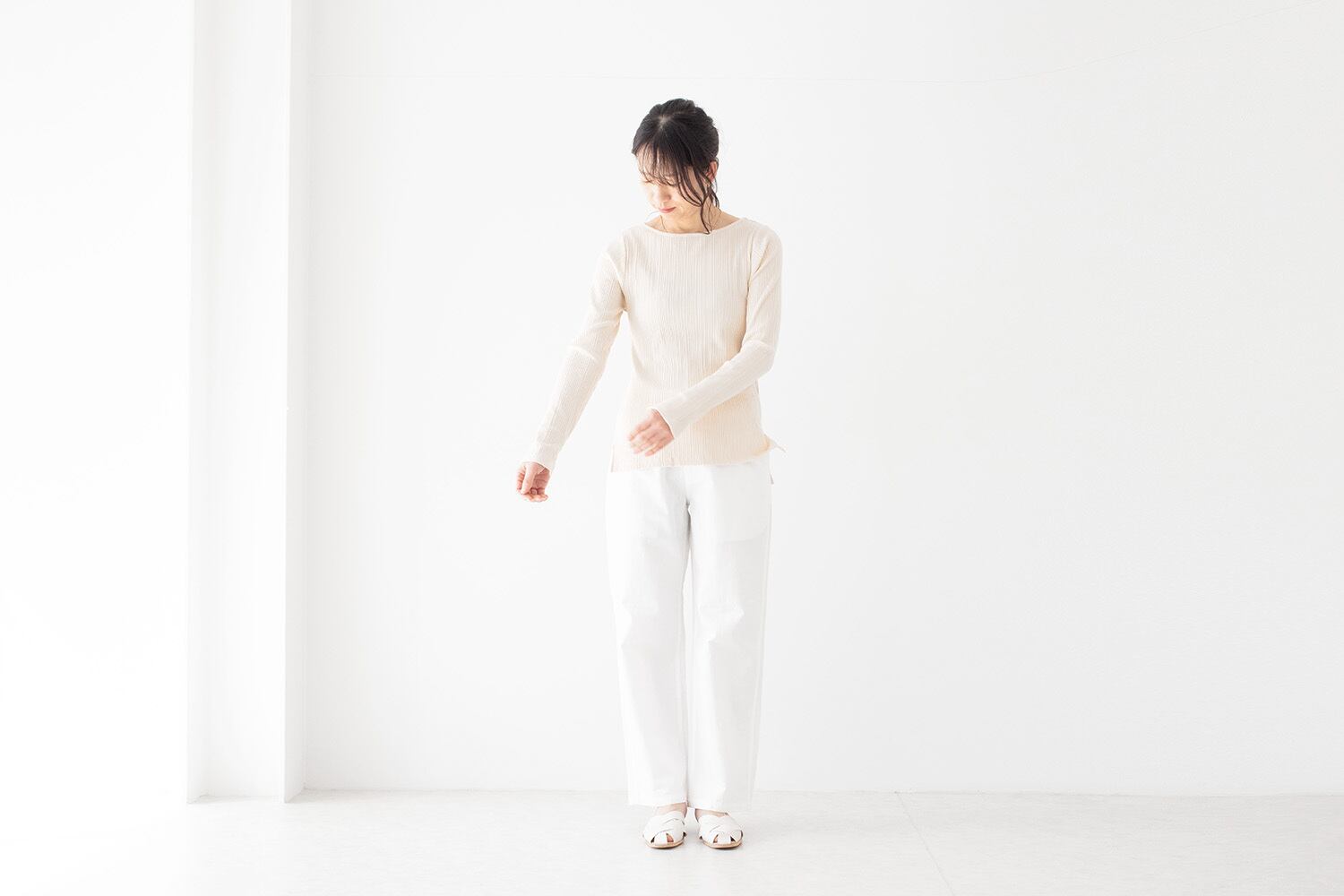 ボディにフィットするすっきりとしたシルエットと、横に広いネックラインで女性らしいバランスに仕立てました。