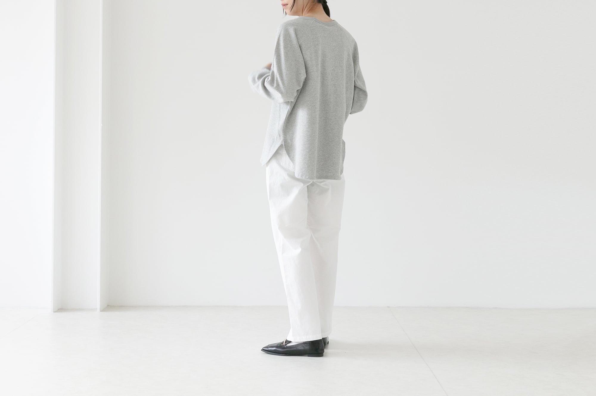 ラグランスリーブでカジュアルなデザインですが、裾はラウンドしたシャツテールで落ち着いた雰囲気です。