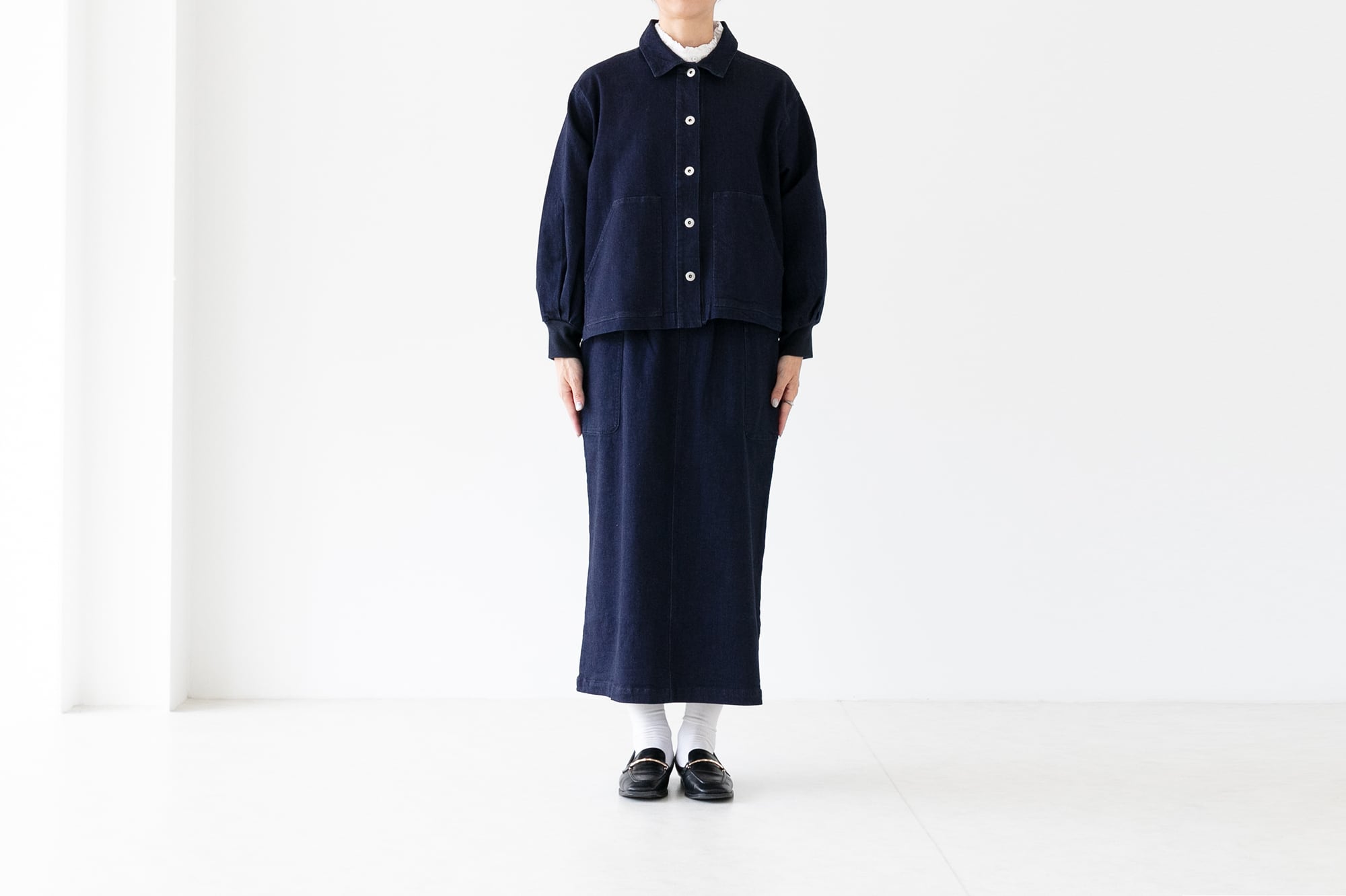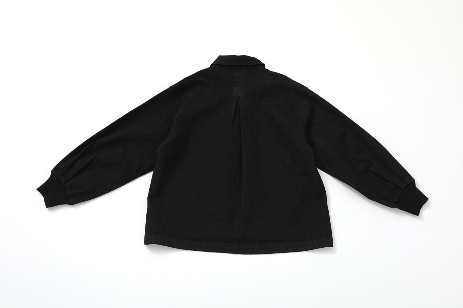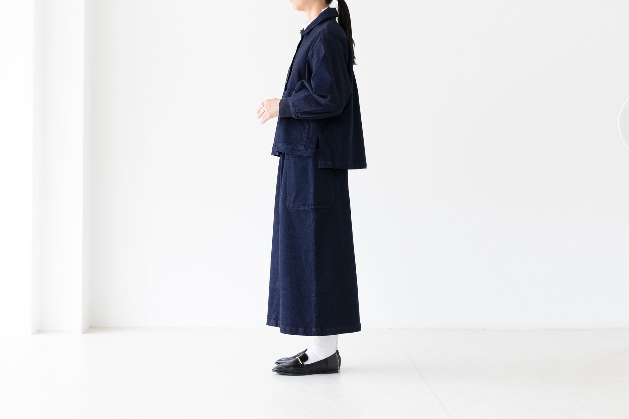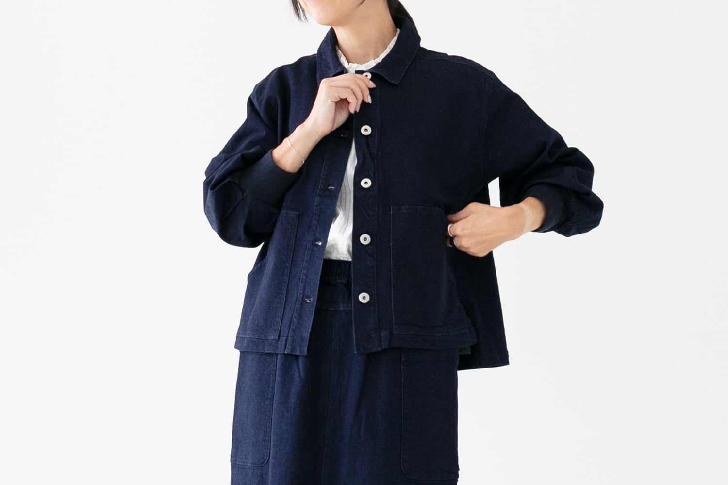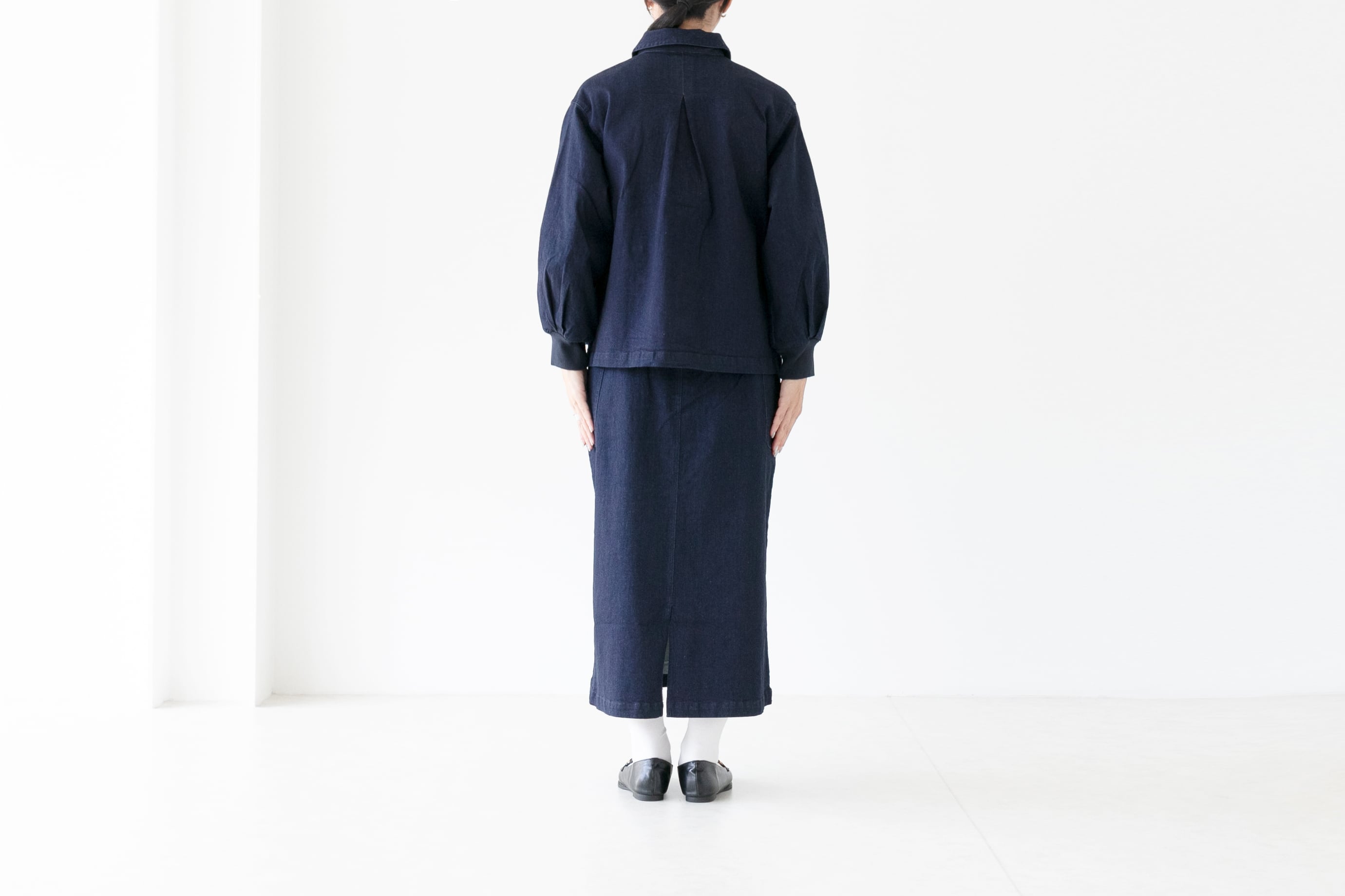 ボリュームのある袖のデザインは、手首の細見え効果がありフェミニンな印象。袖口のゴムでたくし上げも簡単です。ウエスト部分の大きな貼りポケットとサイドのスリットがアクセント。後身頃に入ったタックも丸みのあるシルエットで、メンズライクなイメージがあるデニムジャケットですが、柔らかく女性らしい印象になるように作成しています。