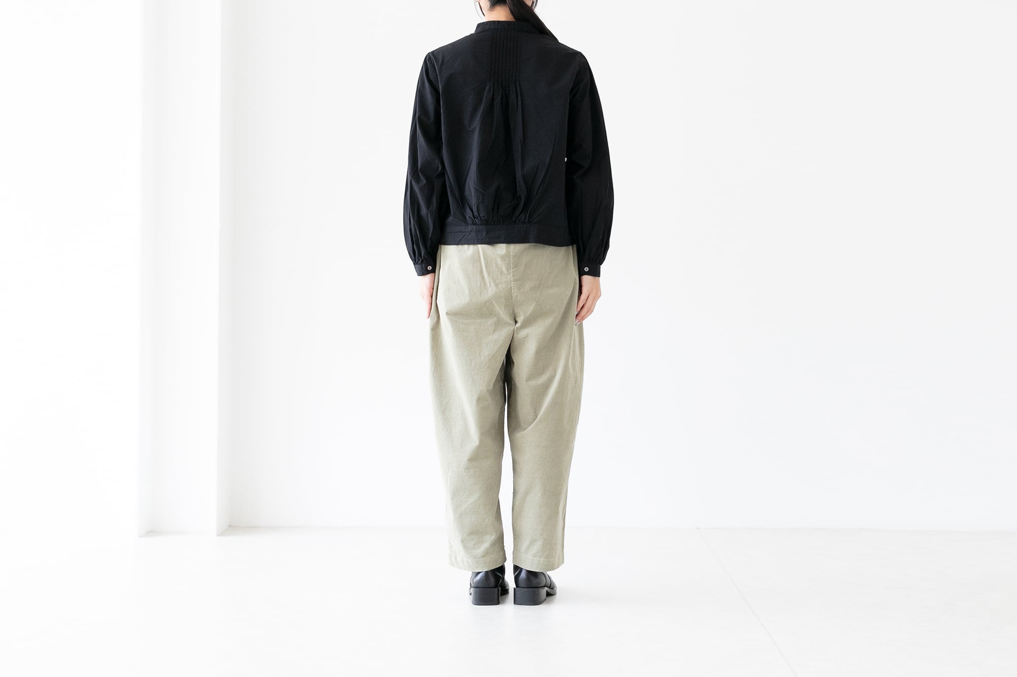 きちんとした生地感でギャザーやタックが美しく、レディーライクなデザインが映えます。前立てのフリルがアクセントになってブラウスは裾部分に共地の切替を入れることでカーディガンやブルゾンのようなシルエットになっています。きちんと脇にポケットも作成してありますので、本当にアウターとしても着用できます。シャツ生地なのできちんと感もあり、本格的に寒くなる前の季節にぴったり。
