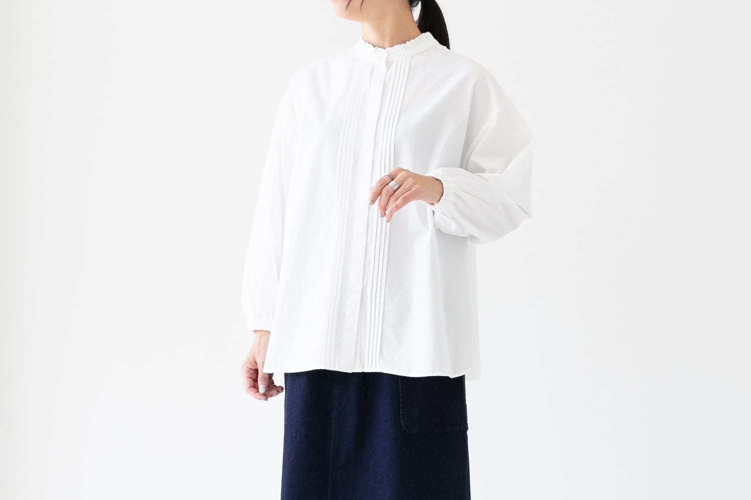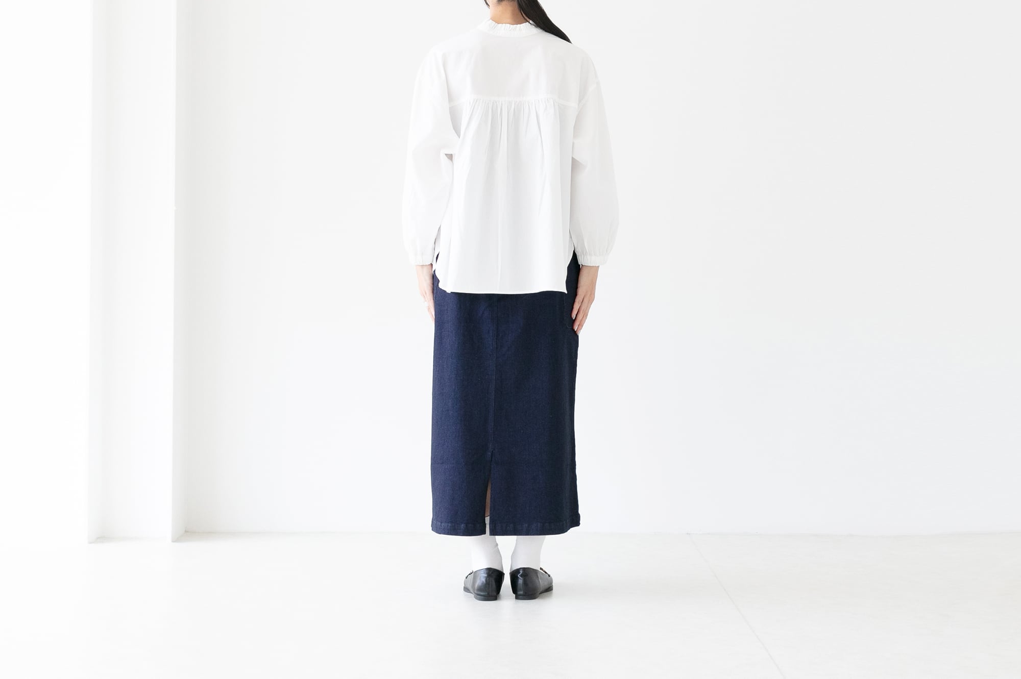 しっかり目のブロード生地に製品洗いをかけてナチュラルで素朴なワッシャー感をプラスした2WAYギャザーブラウス。前後どちらも着用できるのでコーディネートの巾が広がります。