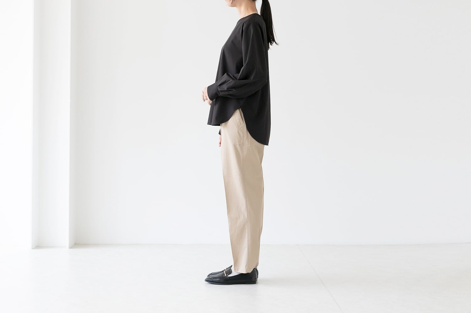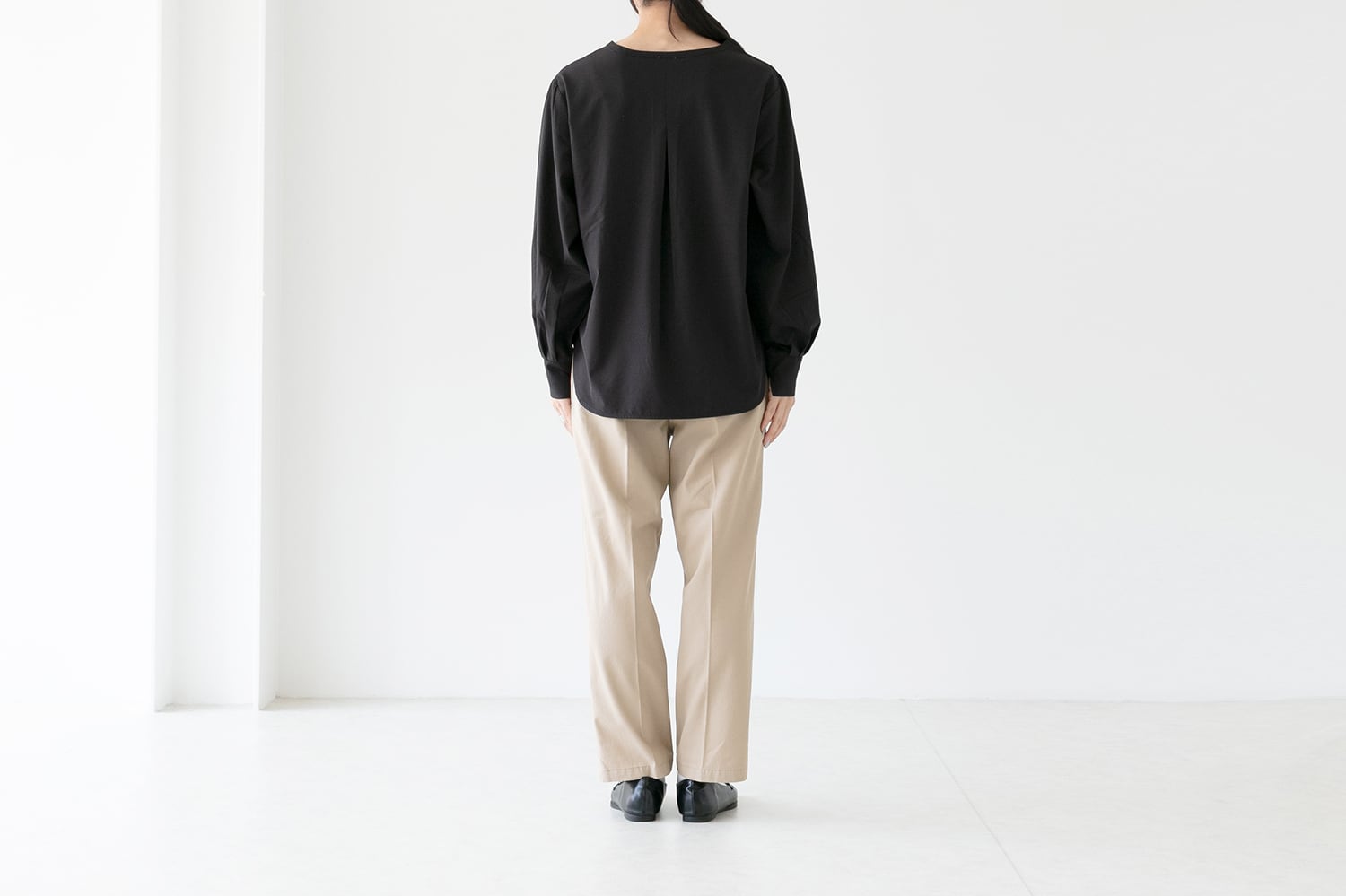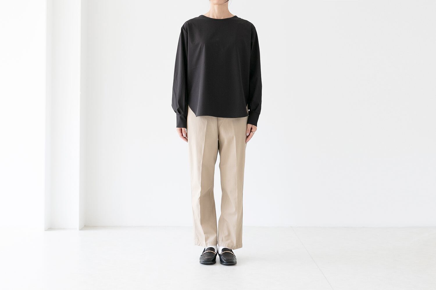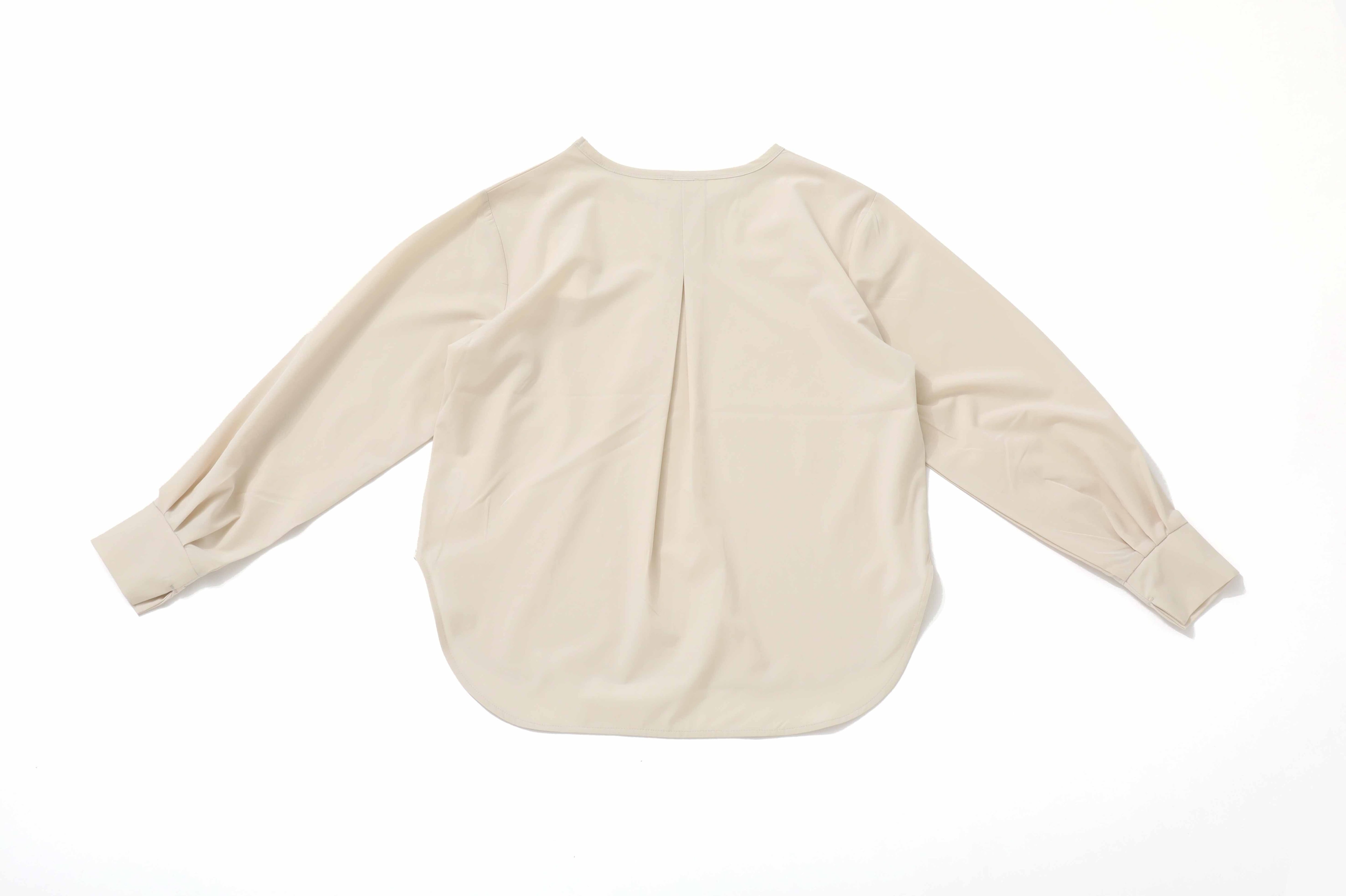 マットな質感が上品なストレッチジョーゼット生地を使用したラウンドヘムブラウス。ほんのりとした透け感としなやかな生地感が特徴で、洗濯後もシワになりにくく、お手入れが楽ちんなのも嬉しいポイント。