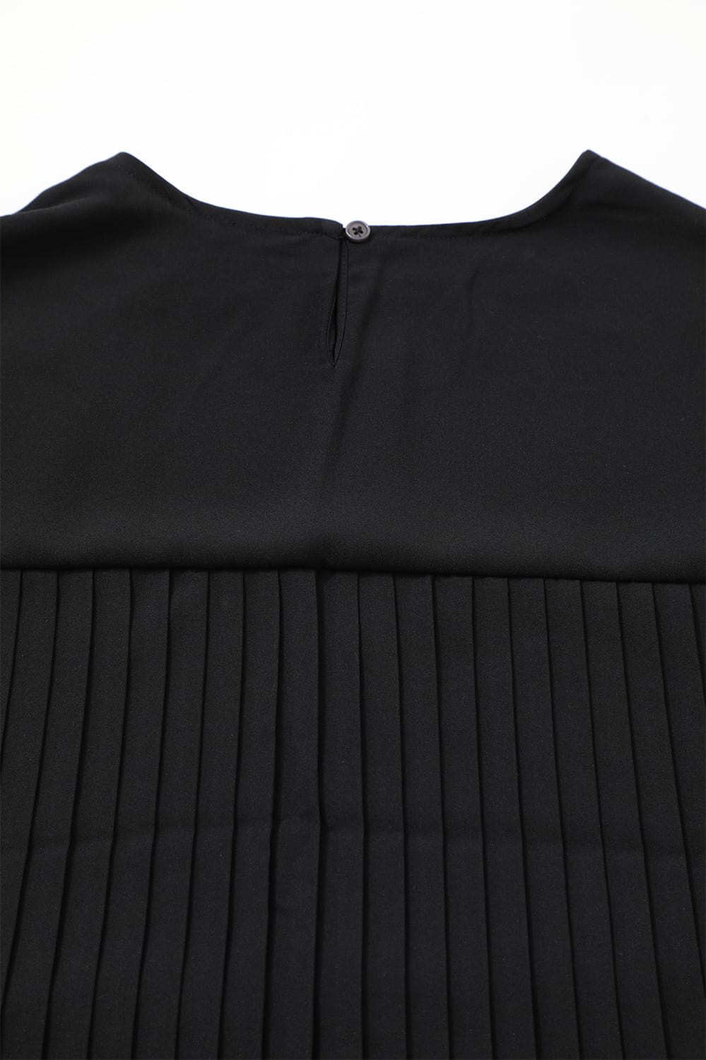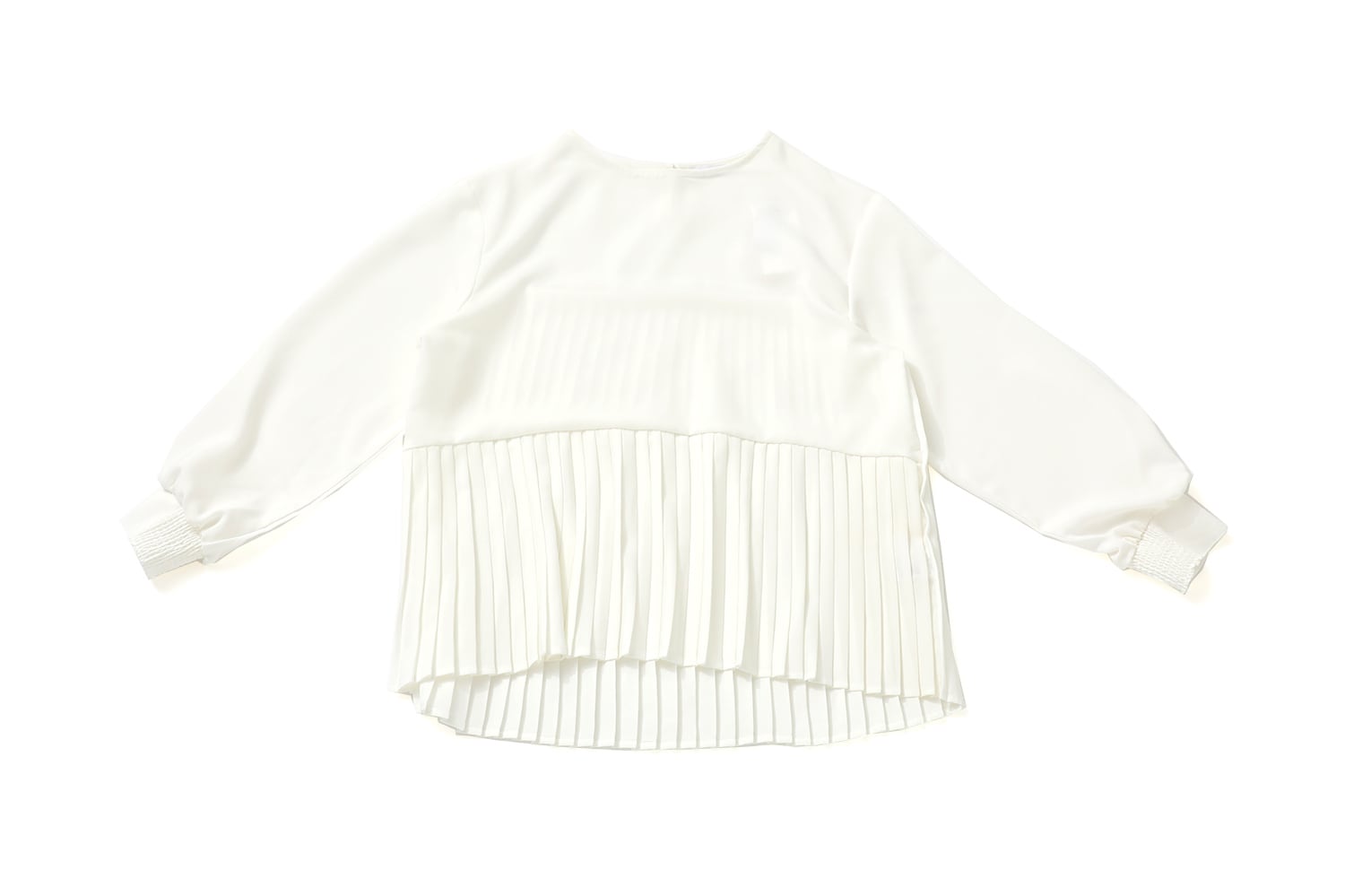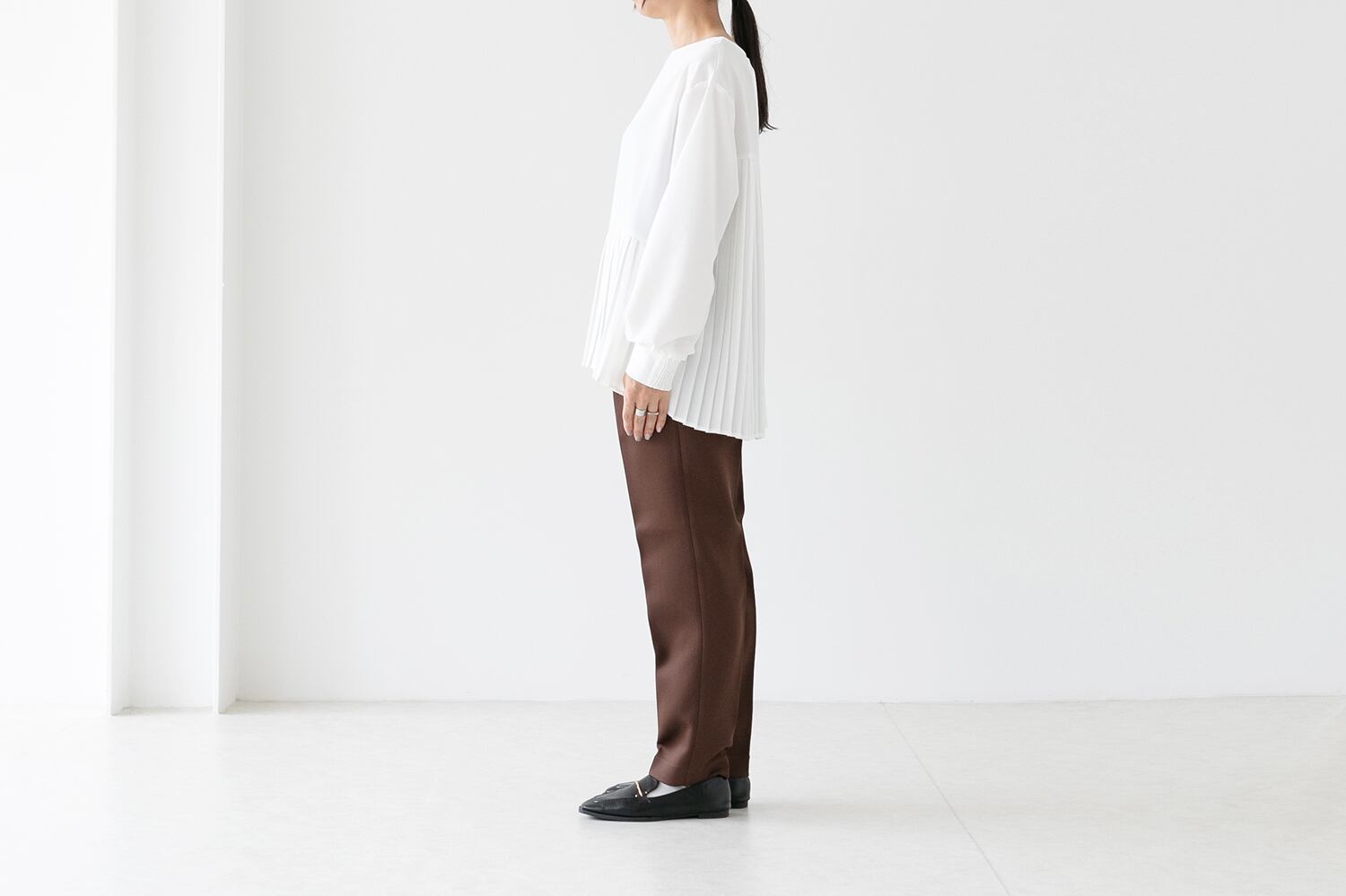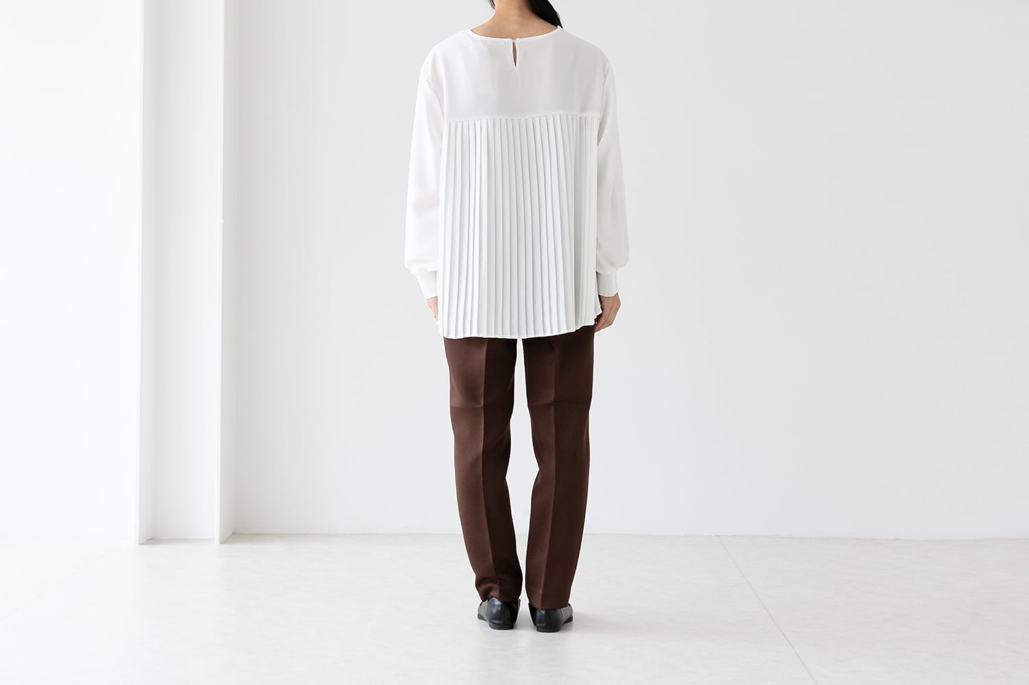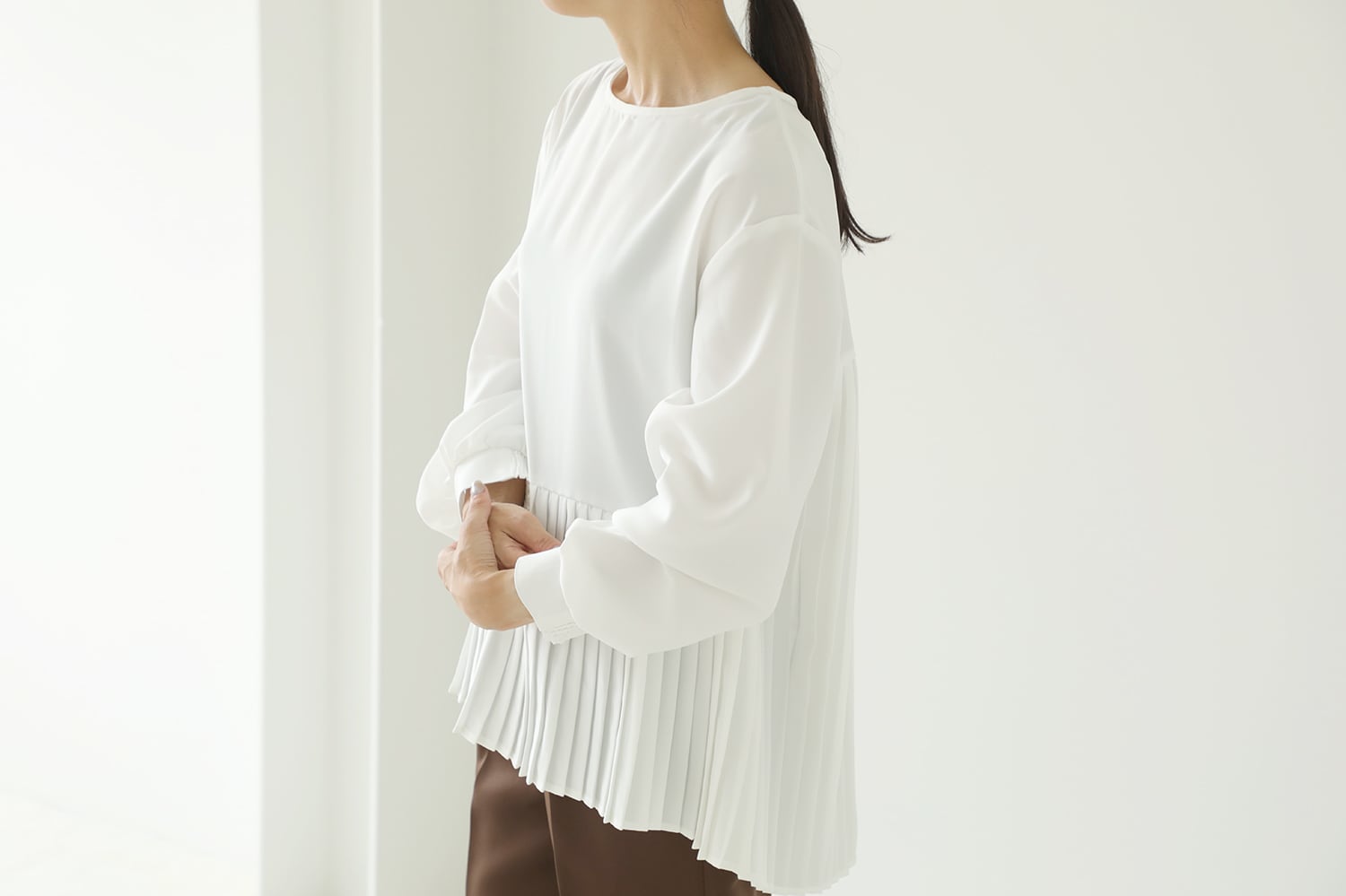 落ち感のある素材で作成した細かなプリーツが美しい切替プリーツブラウス。