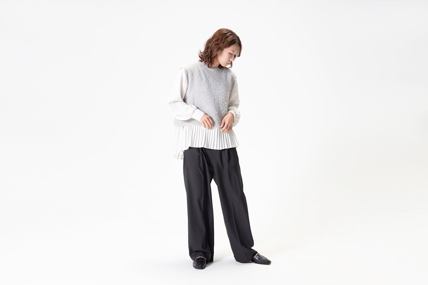 プリーツの切替を高めに入れておりますので、スタイル良く見えるのはもちろんのこと、ショートのベストとも相性抜群です。