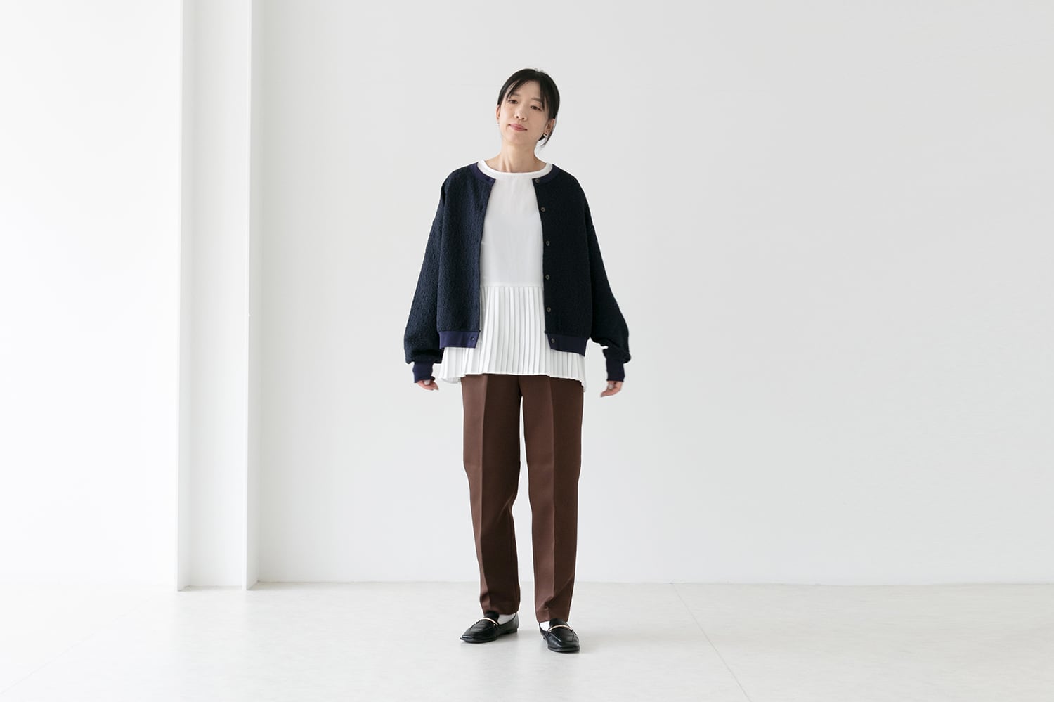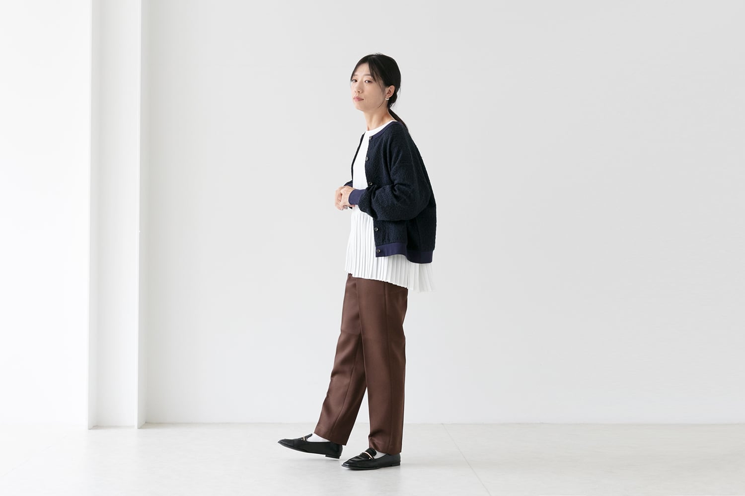 クルーネックのデザインは、パンツやスカートとの相性が良く、シーズンを問わず多様なスタイリングを楽しむことが可能です。