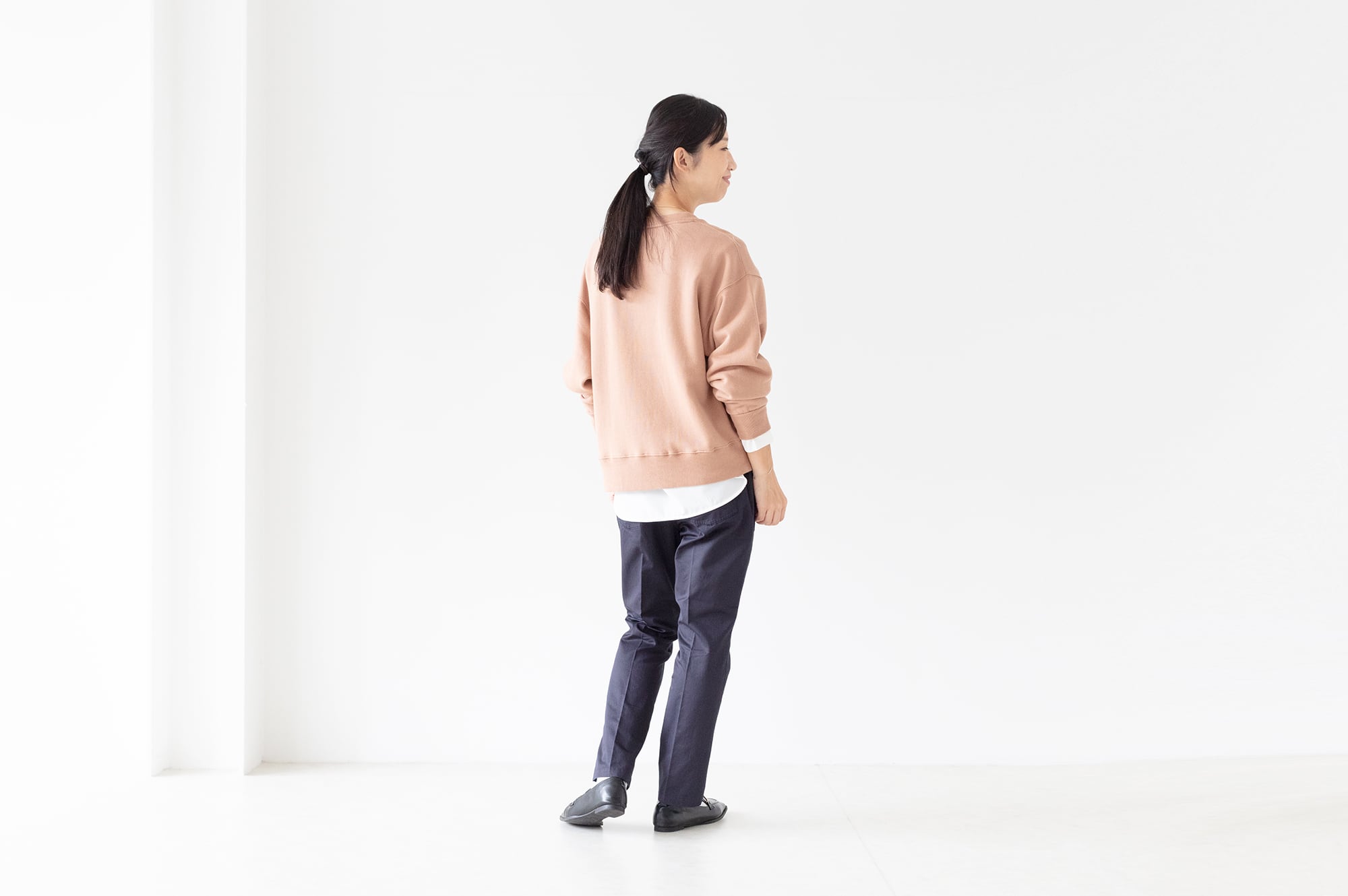 表面にくる上糸には細番手の糸を使用し、カジュアルな印象が強いスウェット素材ですが、目面が均等できれい目なアイテムとも好相性です。