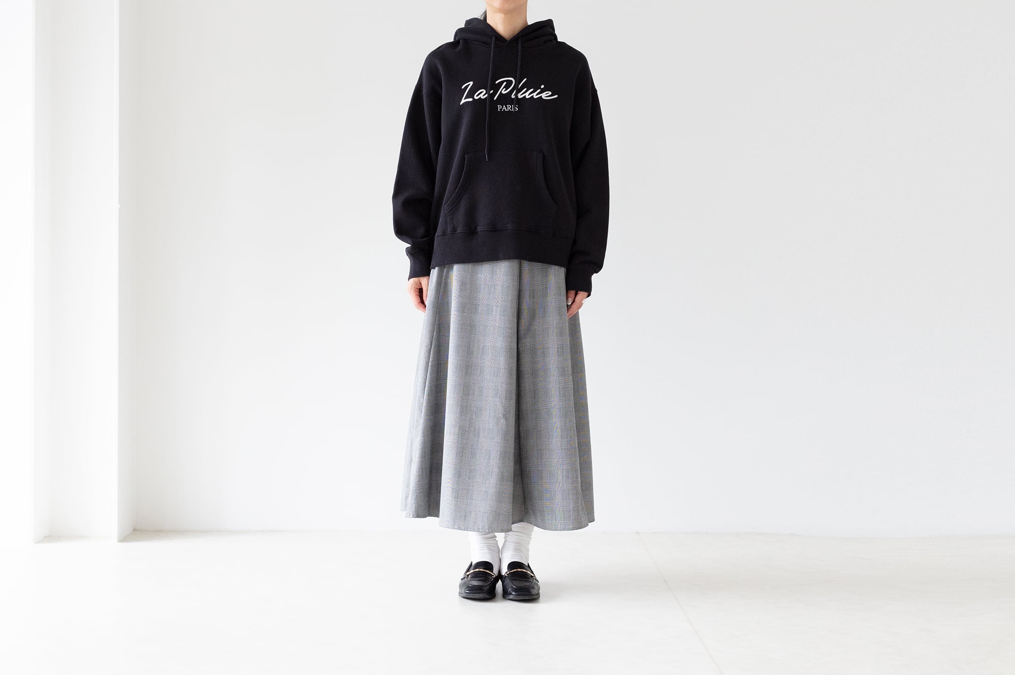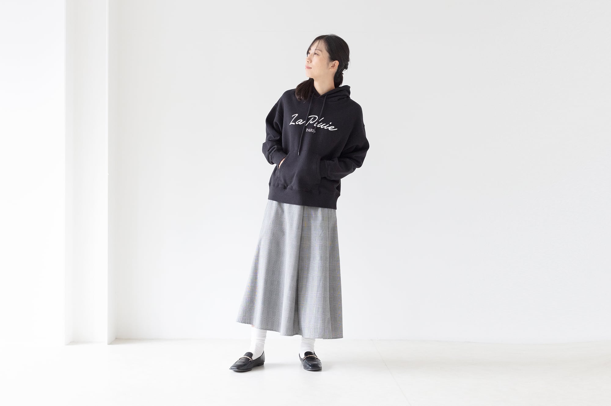丸みのあるリラックスサイズのパーカーに大人っぽいロゴを刺繍しました。