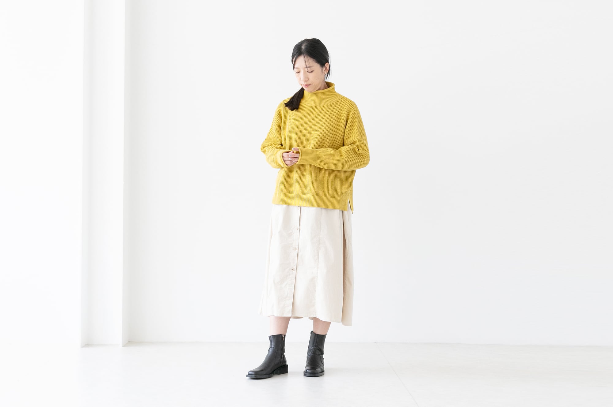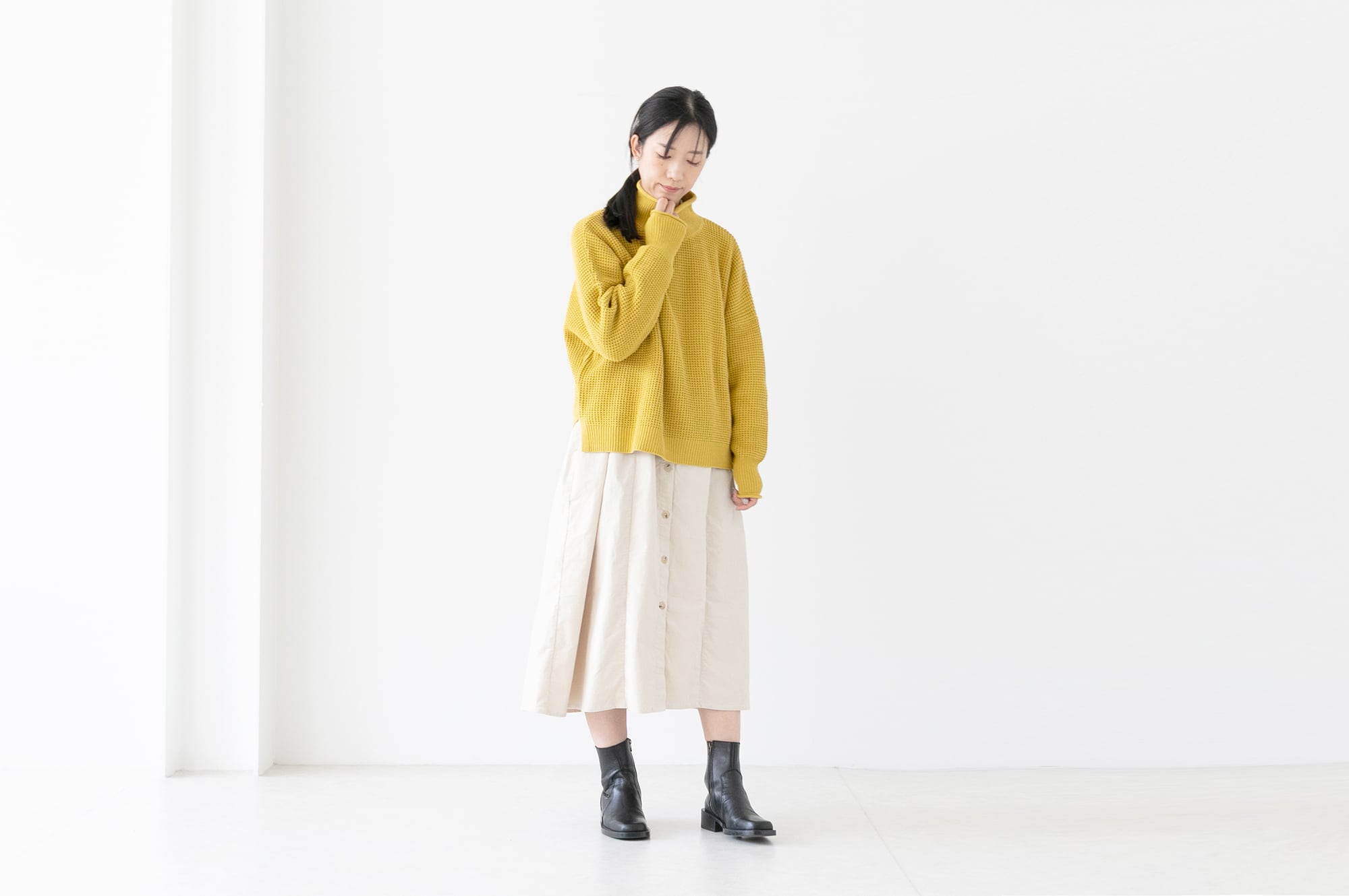 たっぷりとした身巾にゆとりのあるデザインですが、ストンと落ちるドレープ感のある素材で着膨れしません。サイドにある切替は少し高めに設定しており、ショート丈のベストやプルオーバーとも相性抜群です。
