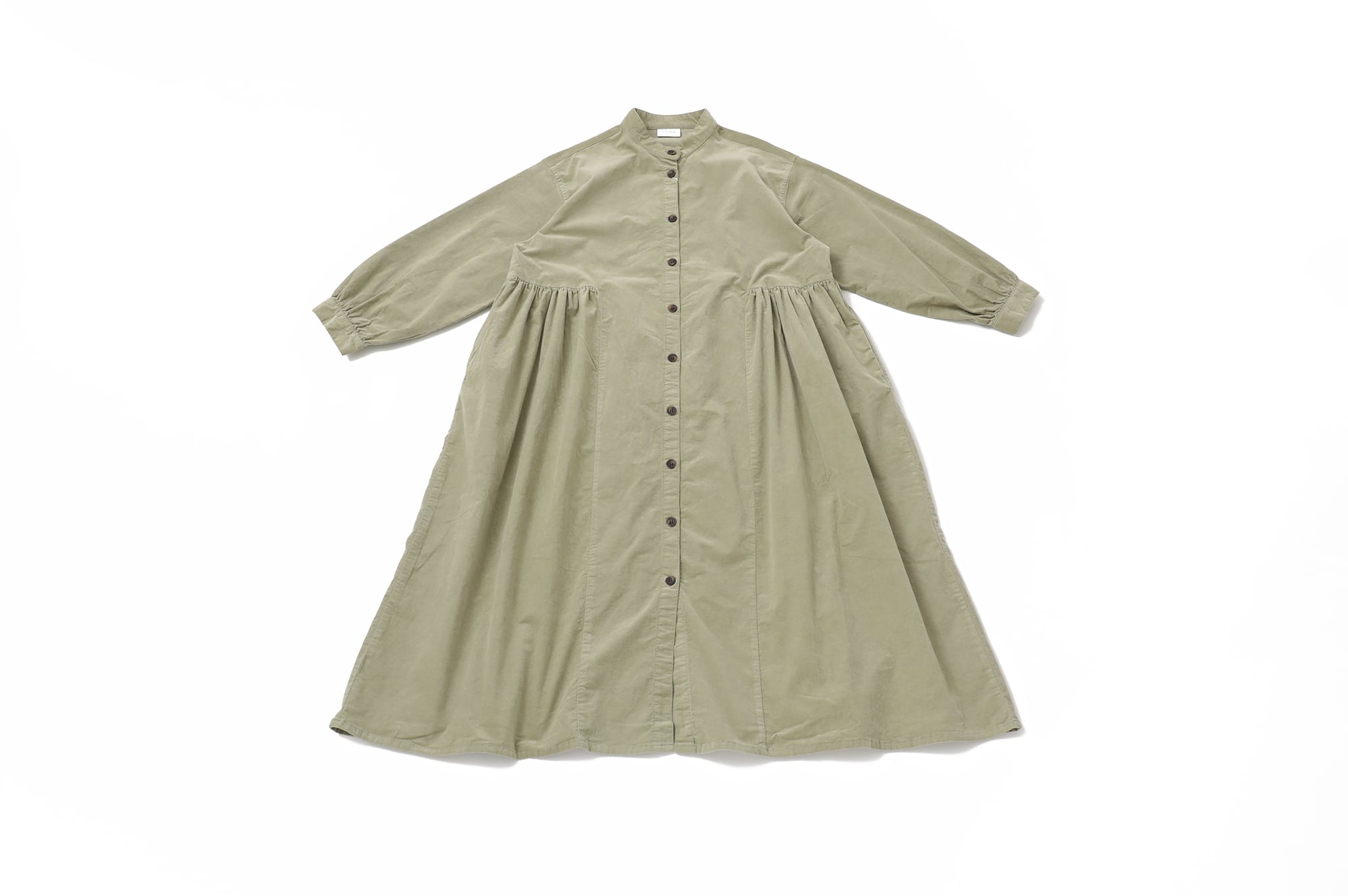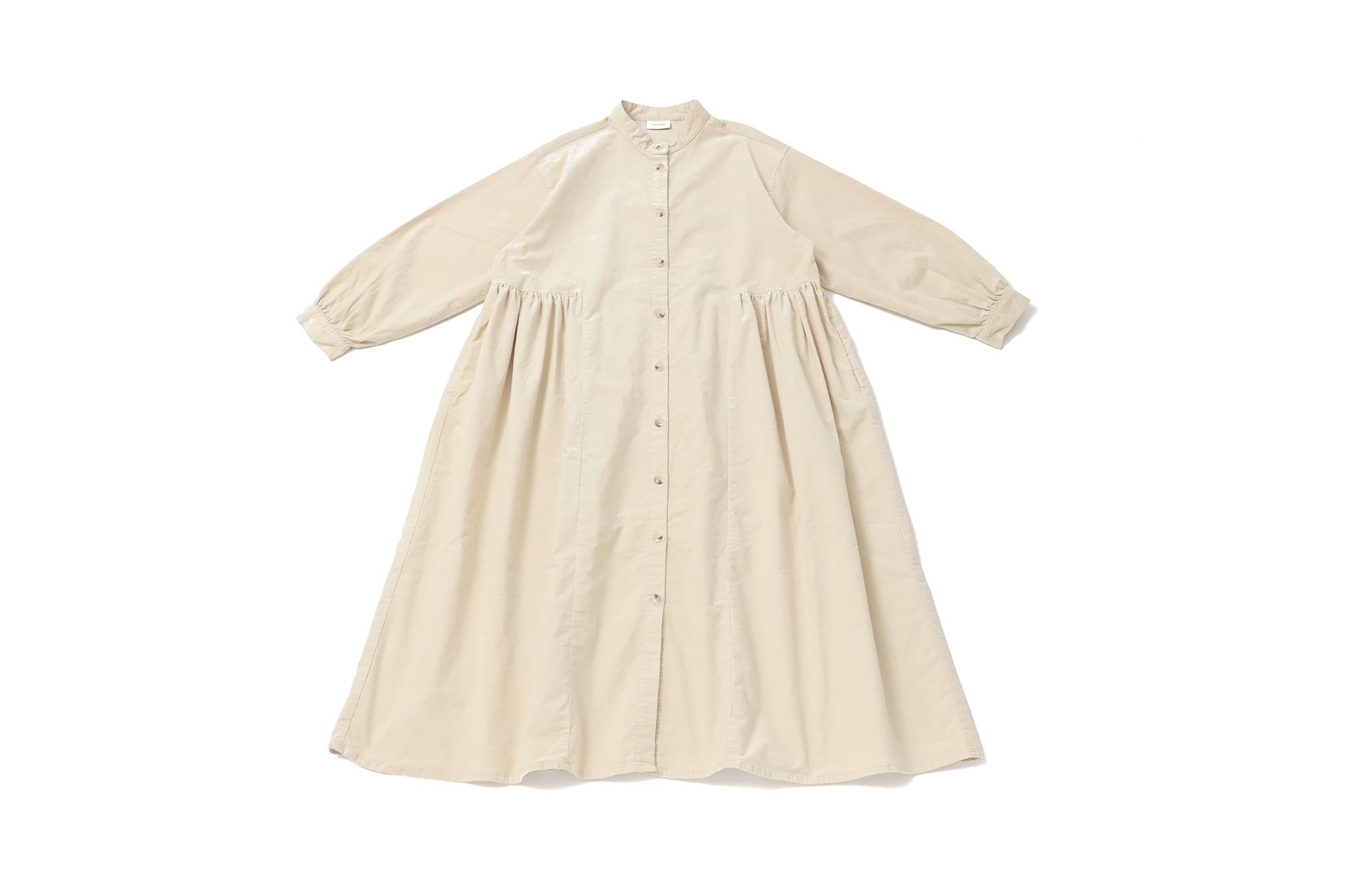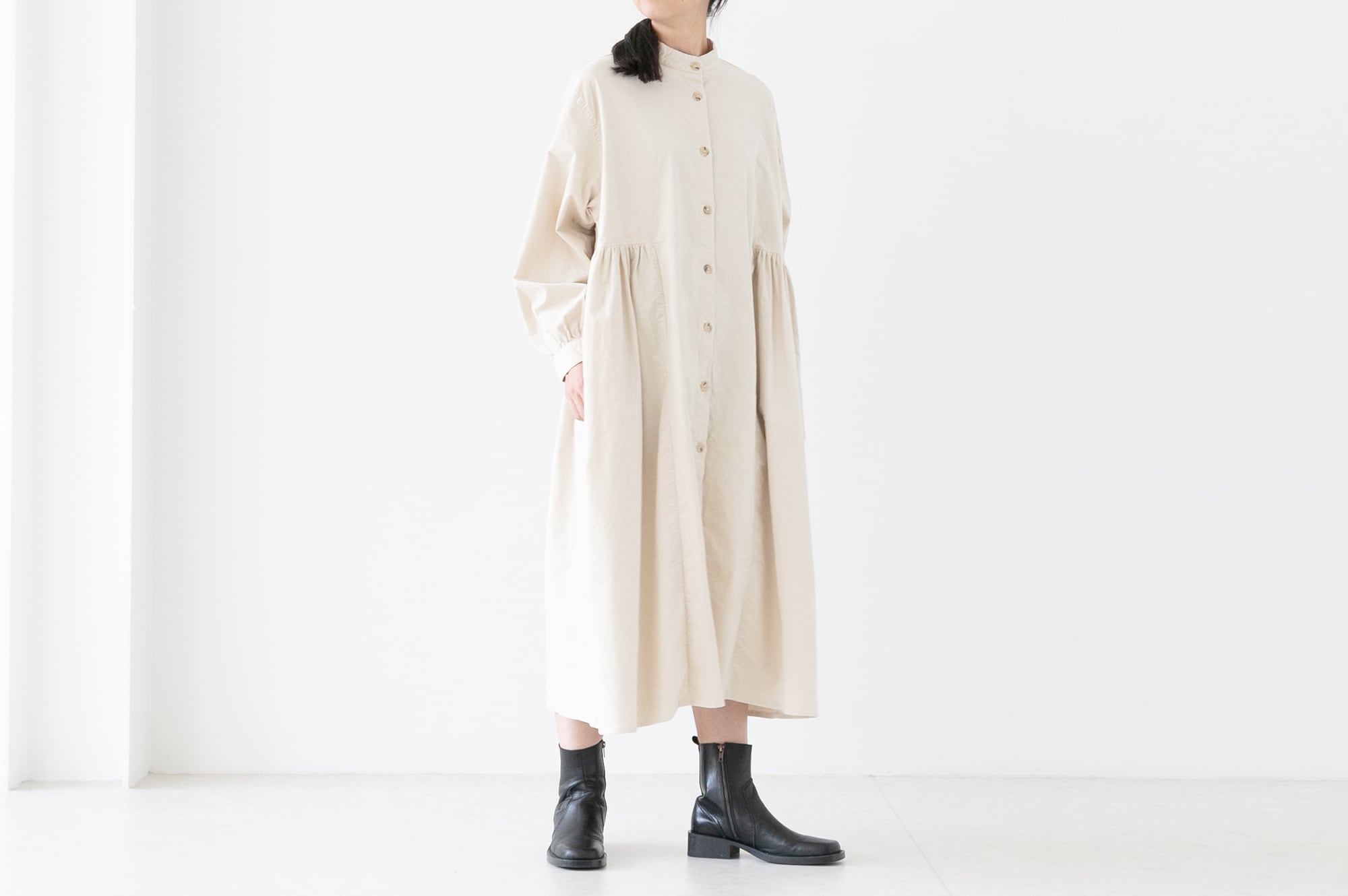 やや薄手で細畝のシャツコール生地に洗い加工を施して、ソフトな風合いとナチュラルなワッシャー感をプラスしたサイドギャザーワンピース。