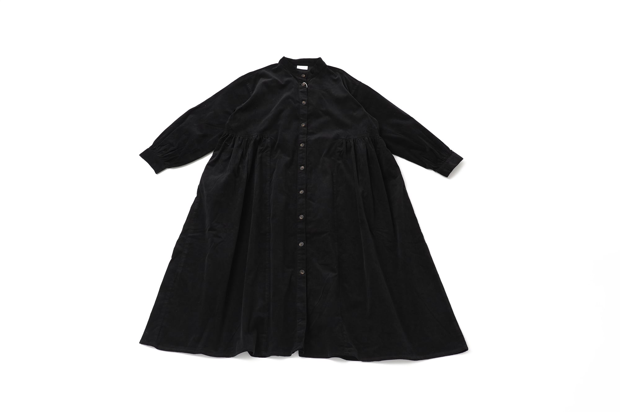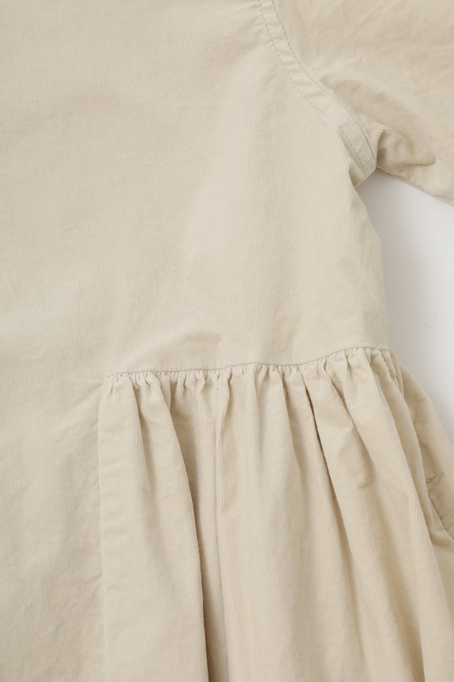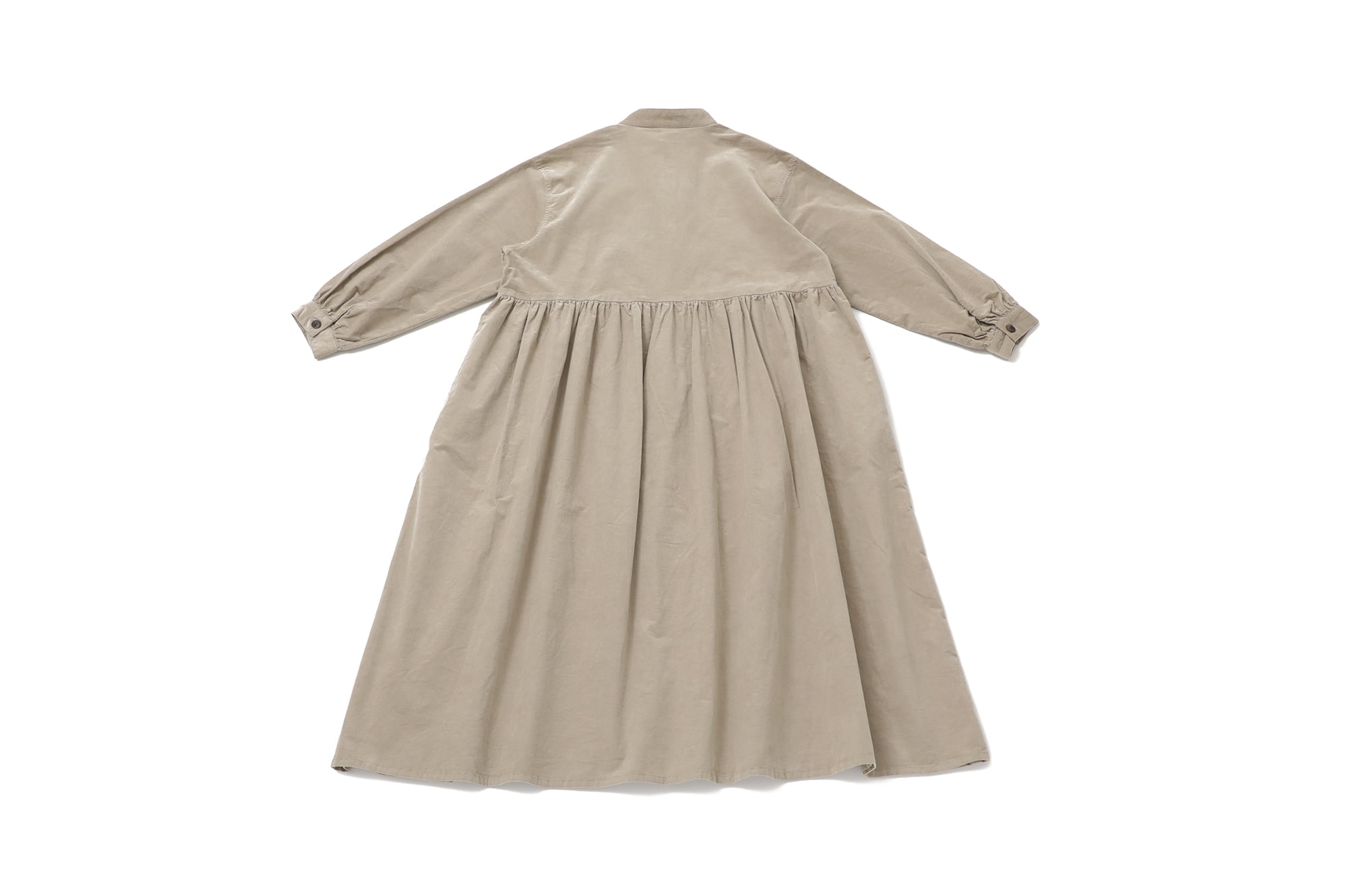 やや薄手で細畝のシャツコール生地に洗い加工を施して、ソフトな風合いとナチュラルなワッシャー感をプラスしたサイドギャザーワンピース。