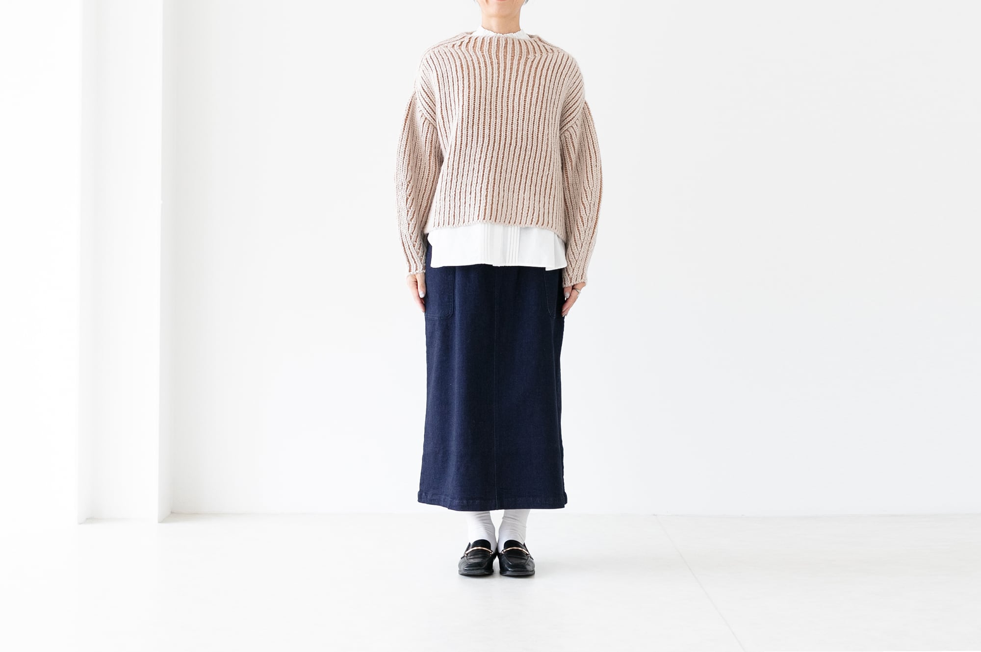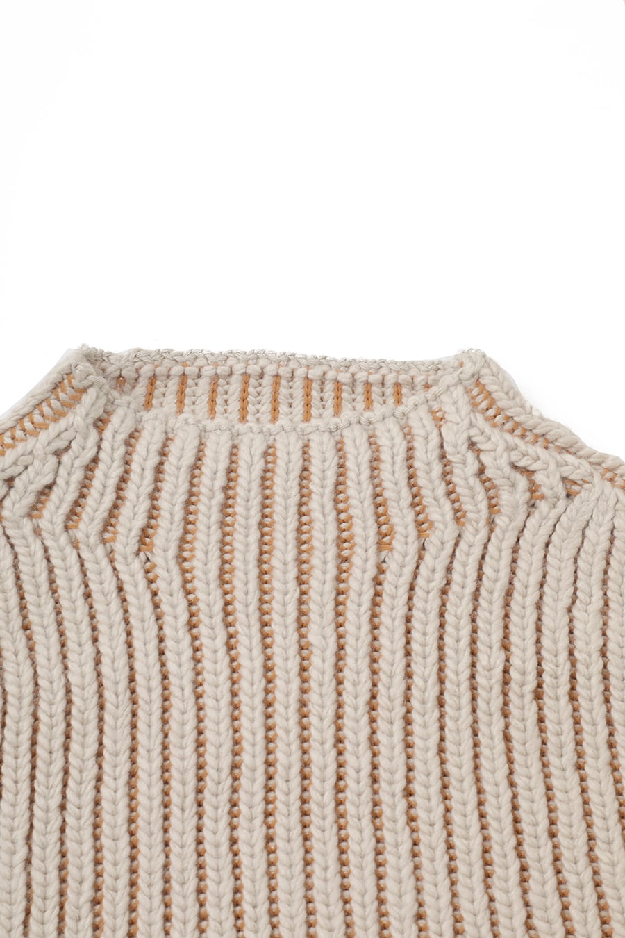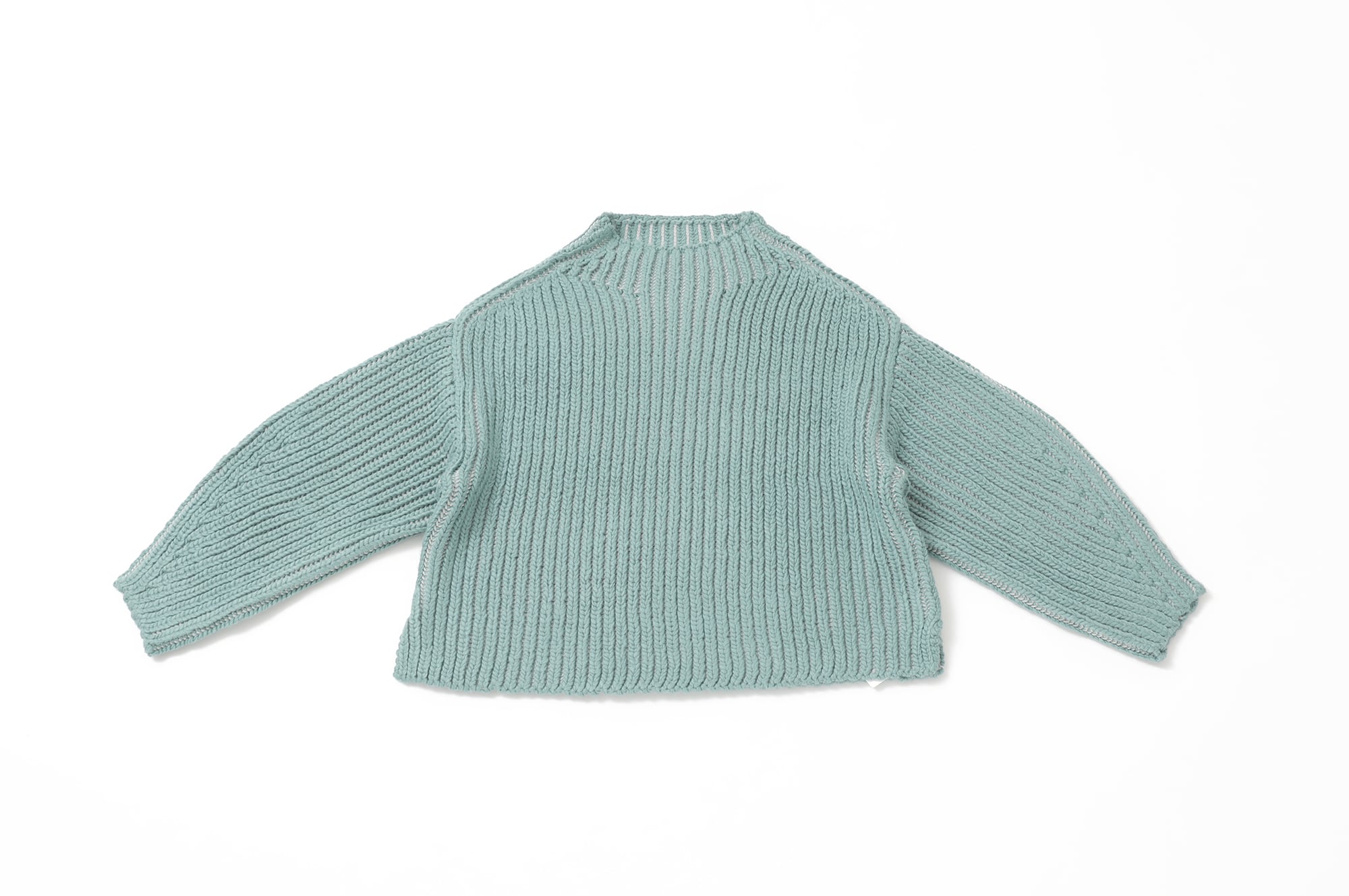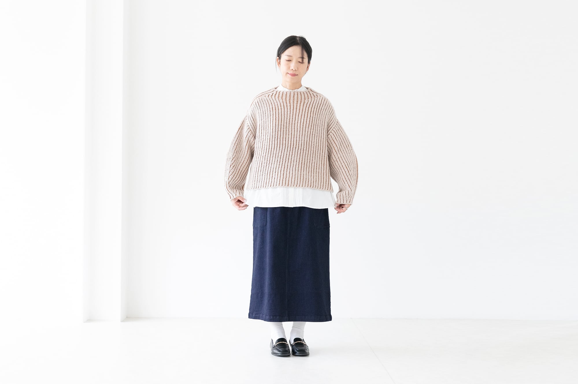 顎にかからない程度のボトルネックで、程よい抜け感を演出しています。袖は端にむかってテーパードするように編み地を工夫したり、レイヤード しやすいワイドシルエットにしたりと、工夫をこらした1着となっています。