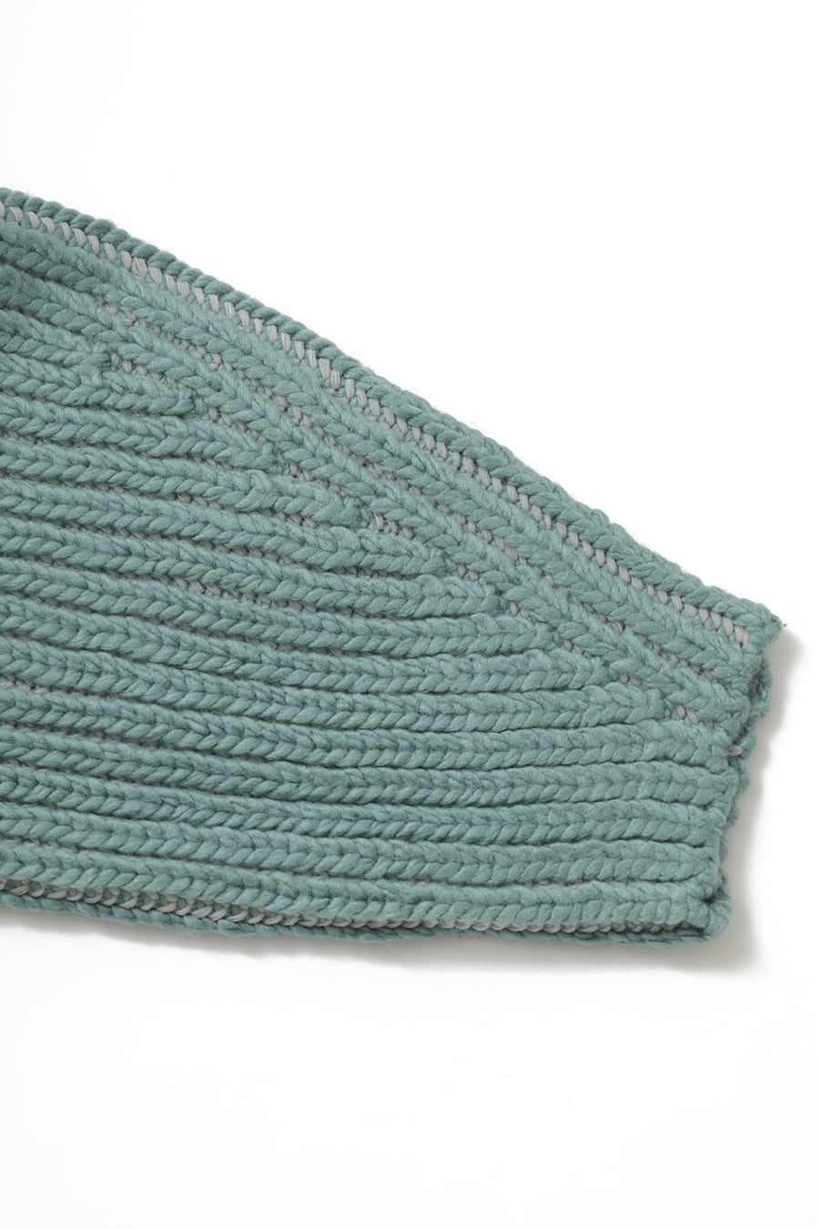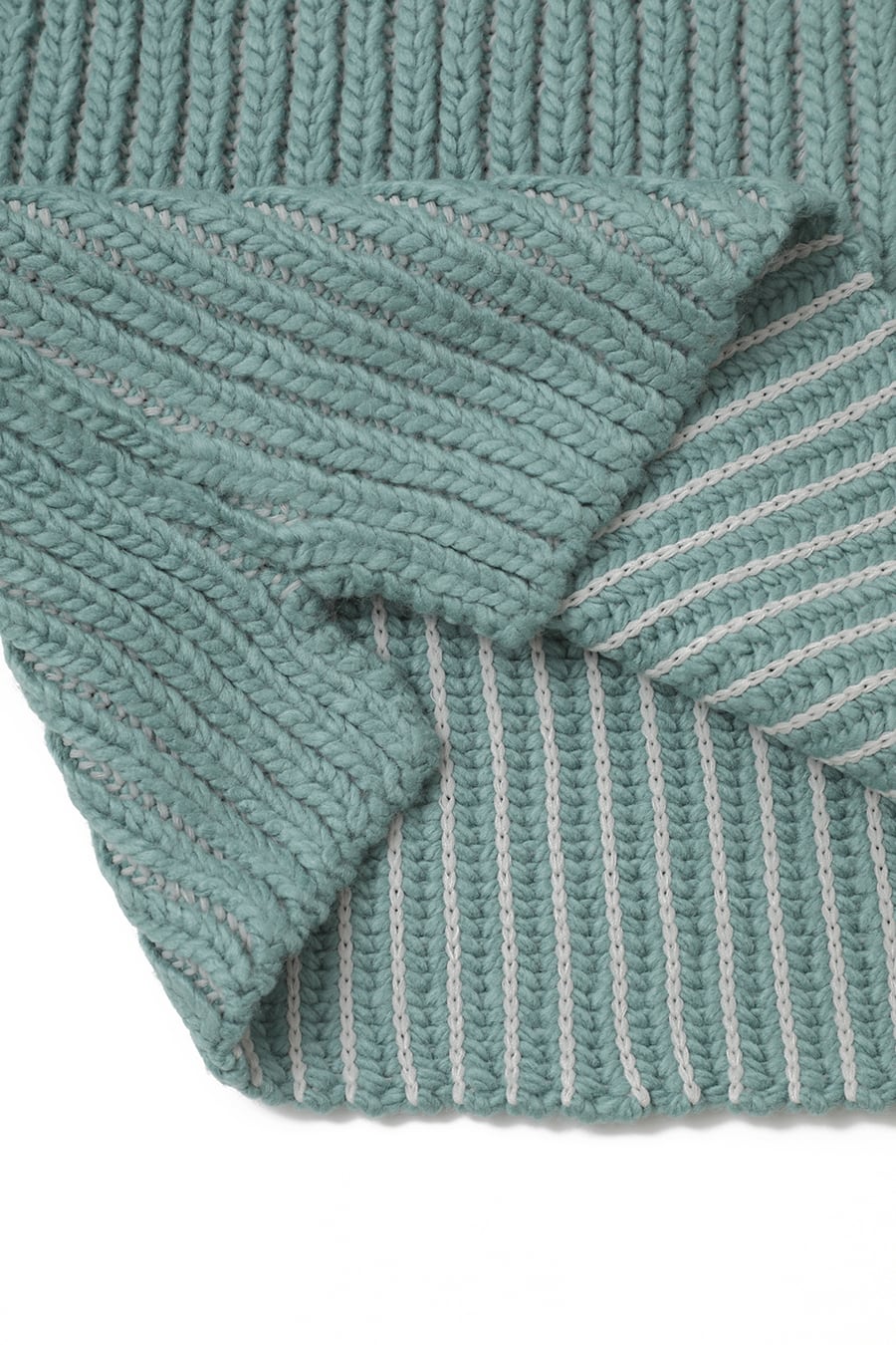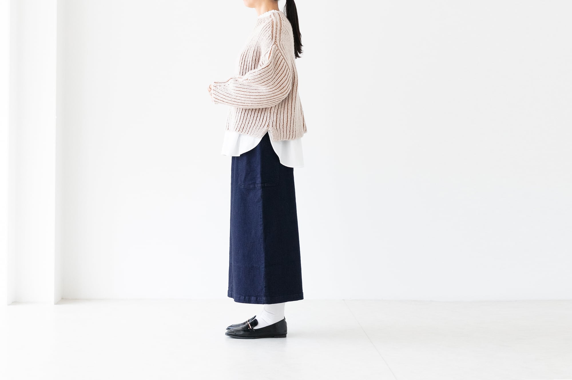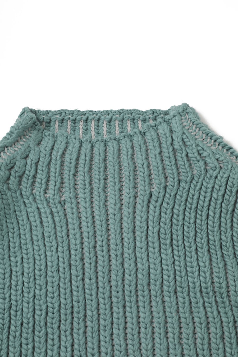 顎にかからない程度のボトルネックで、程よい抜け感を演出しています。袖は端にむかってテーパードするように編み地を工夫したり、レイヤード しやすいワイドシルエットにしたりと、工夫をこらした1着となっています。