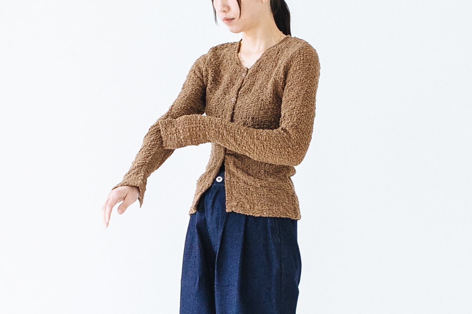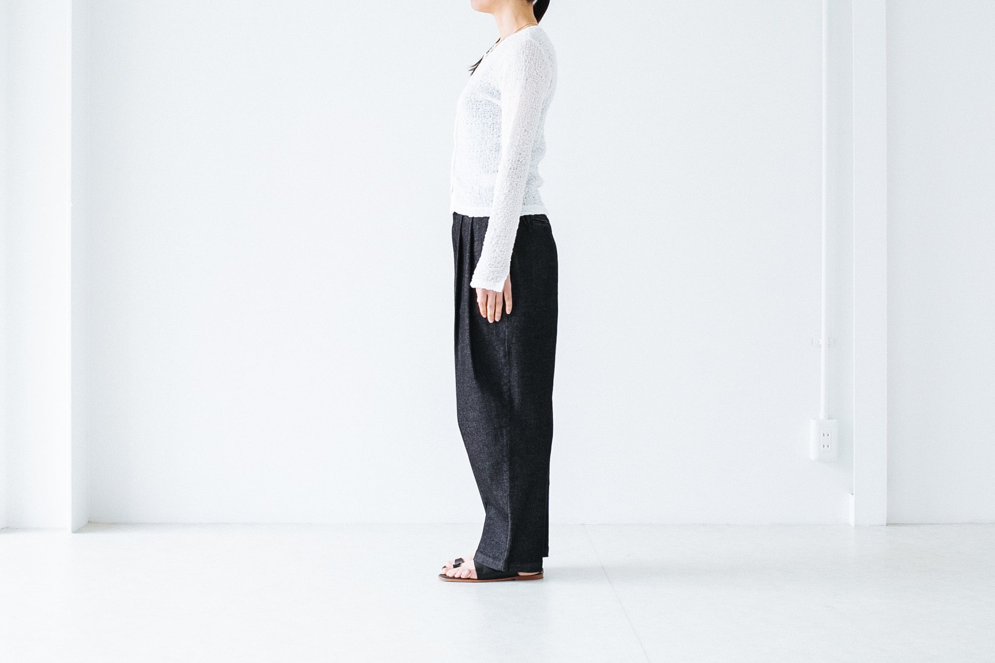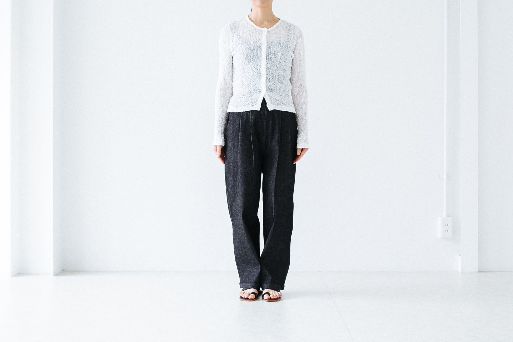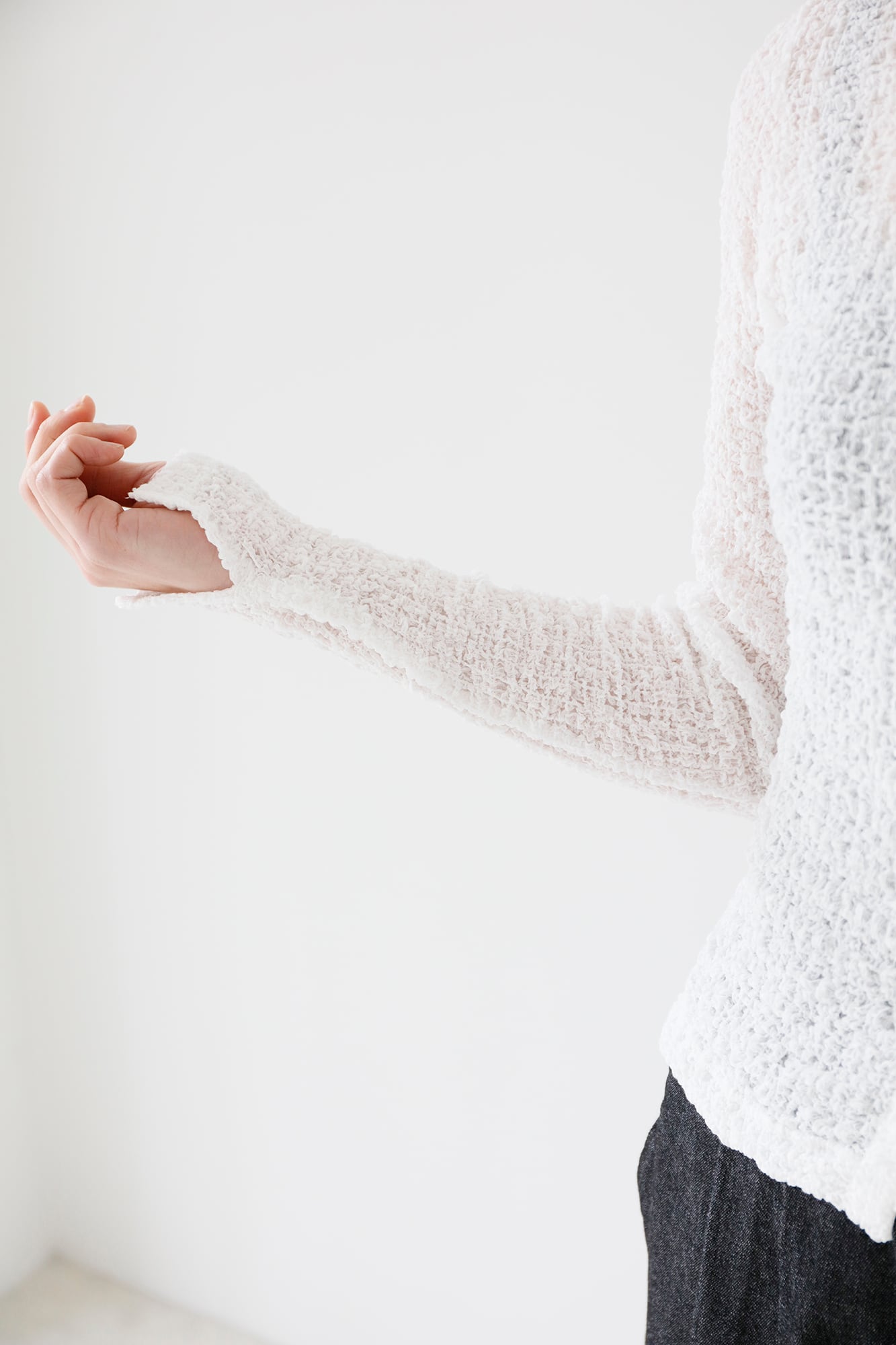 生地感は柔らかくチクチクしないのでブラトップやタンクなどノースリーブのものと合わせるのかベスト。絶妙な透け感でインナーを綺麗に見せてくれます。