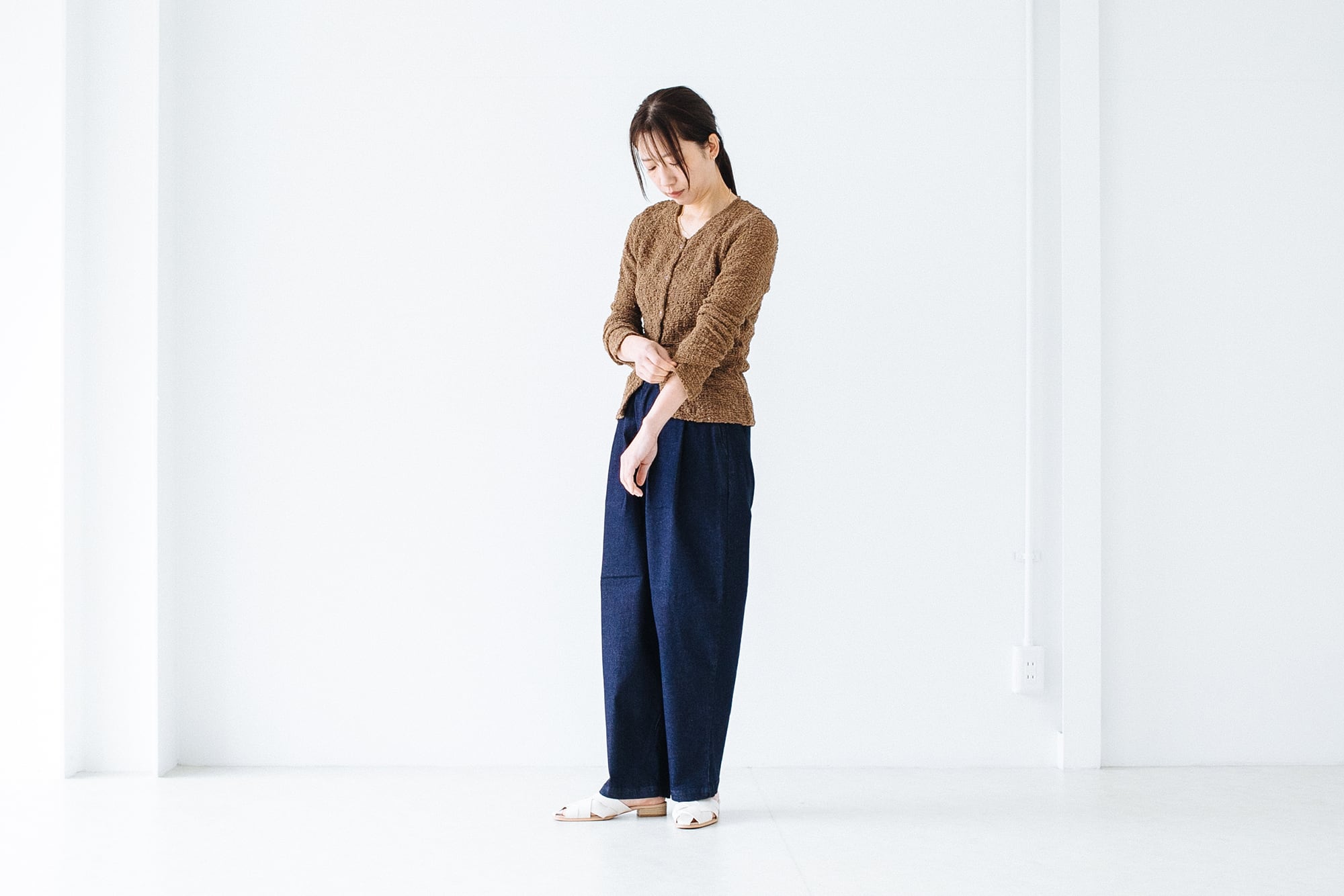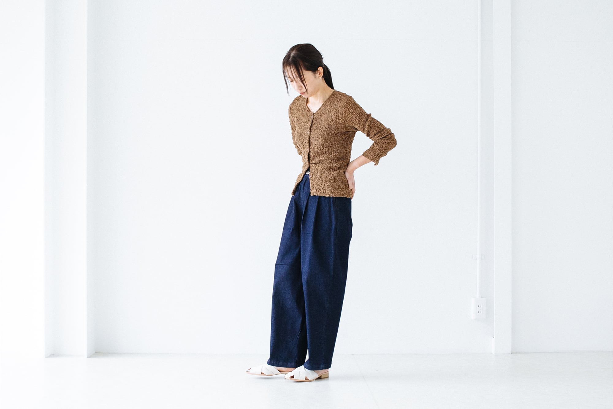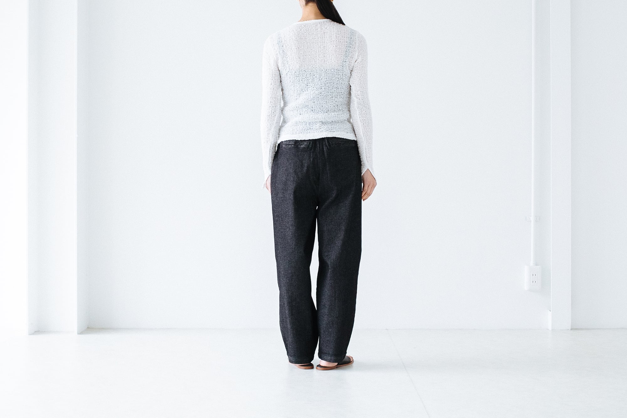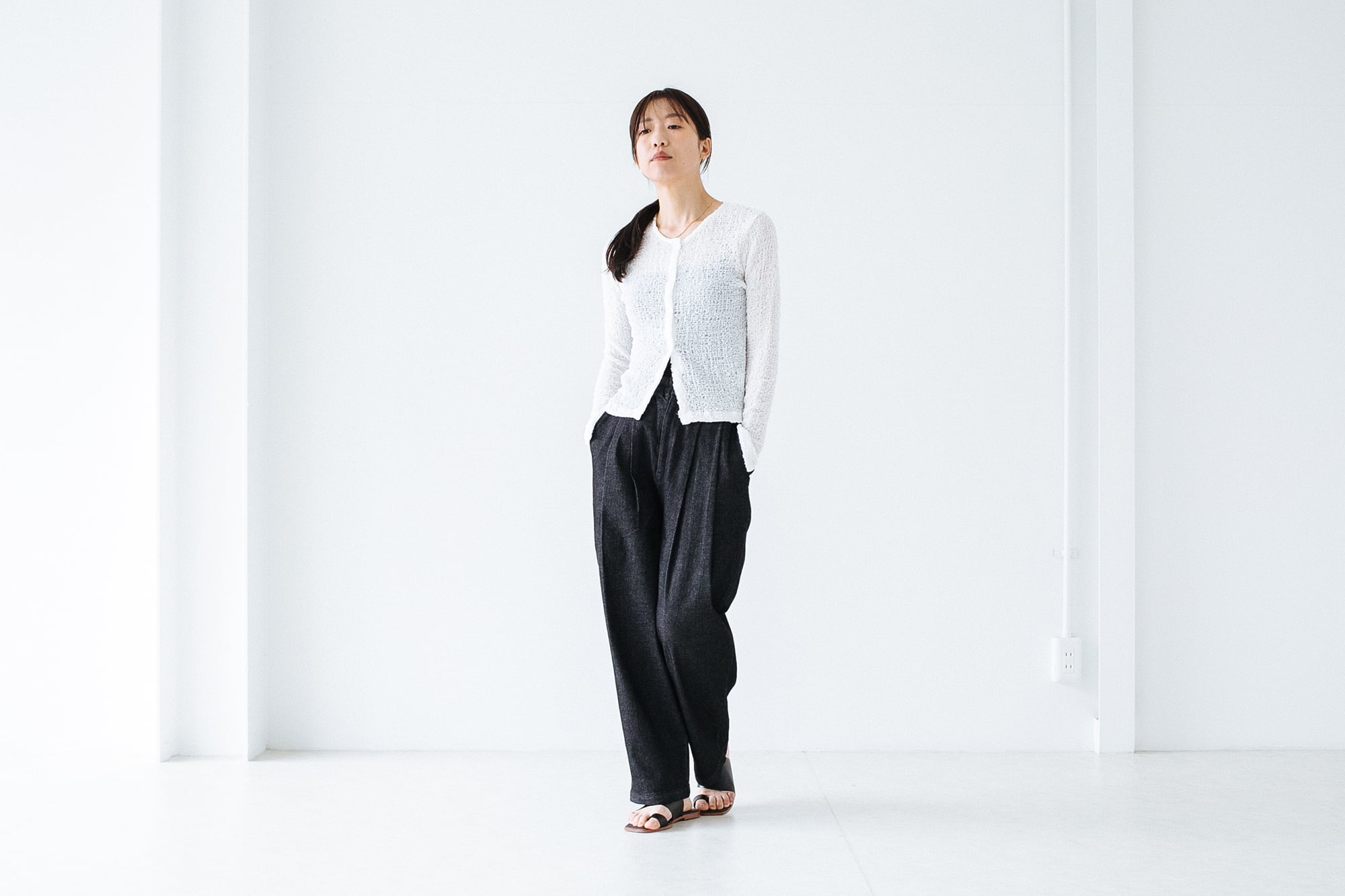 生地感は柔らかくチクチクしないのでブラトップやタンクなどノースリーブのものと合わせるのかベスト。絶妙な透け感でインナーを綺麗に見せてくれます。