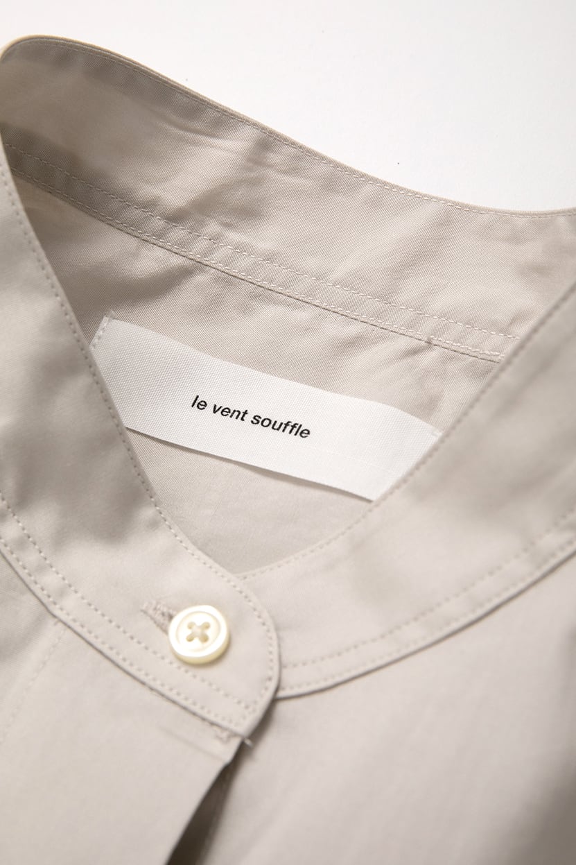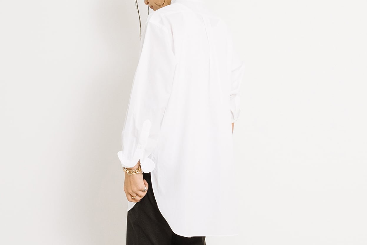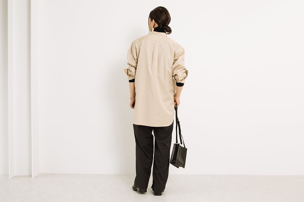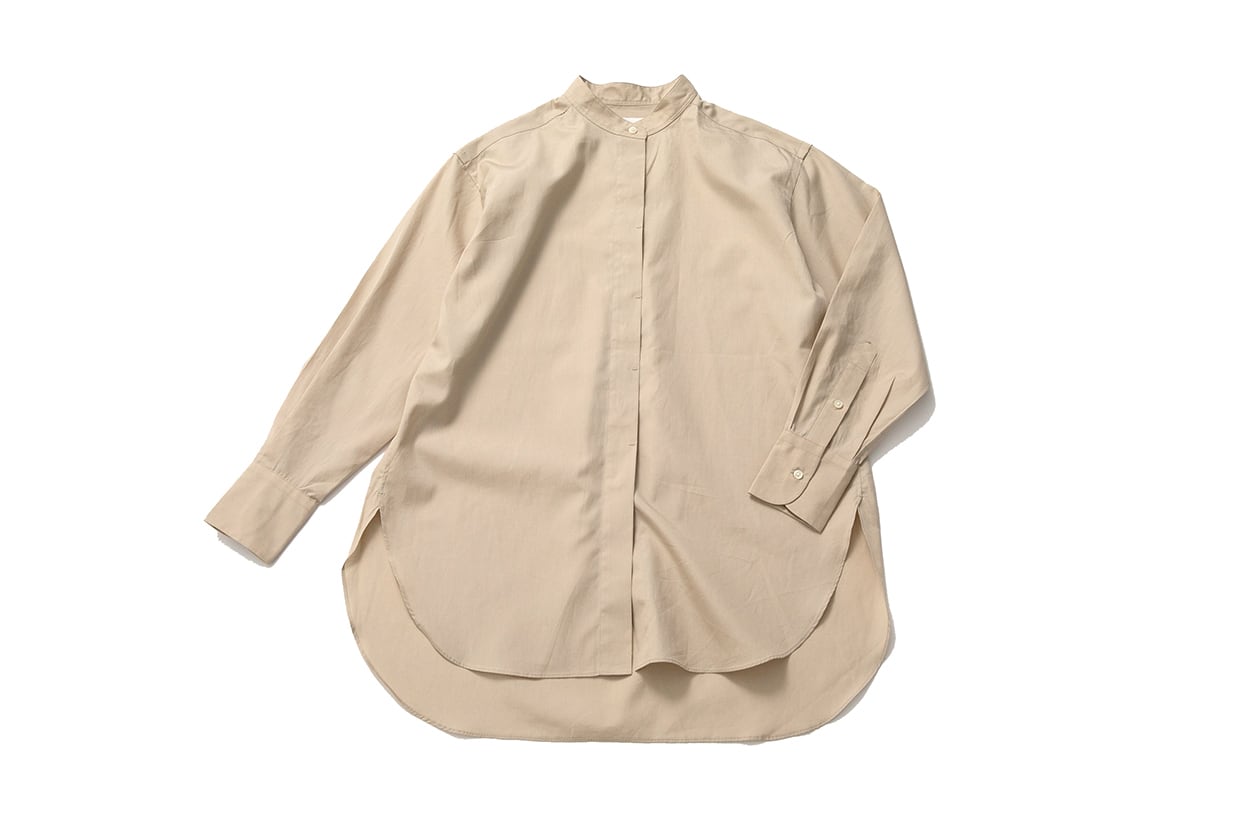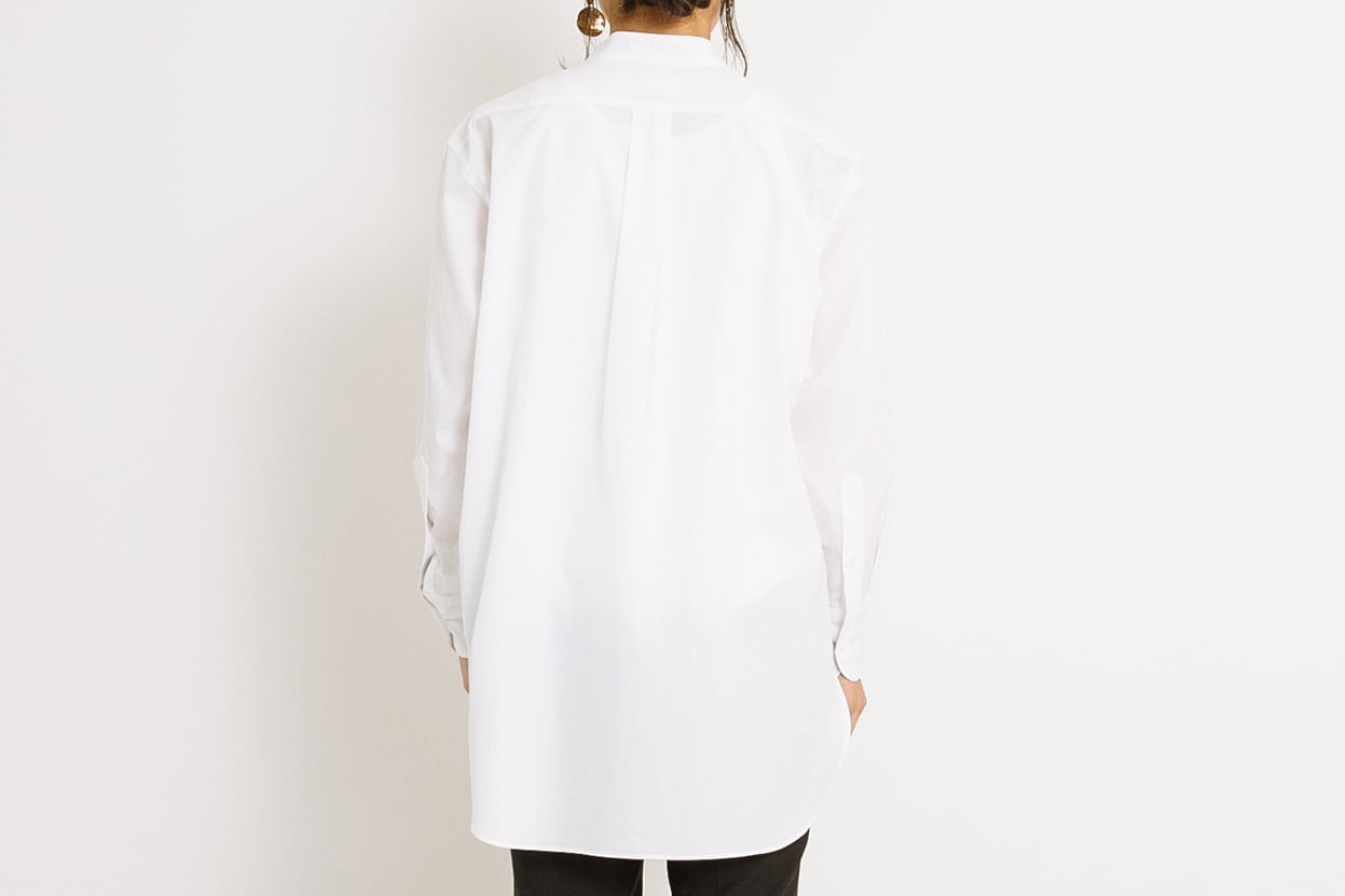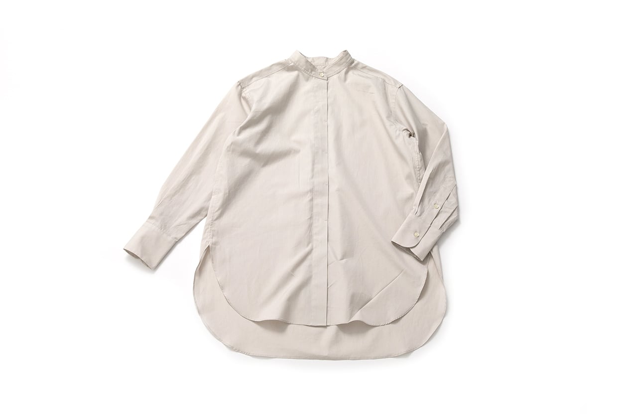 メンズのドレスシャツをベースに、女性らしい曲線をプラスしたバンドカラー比翼シャツ。