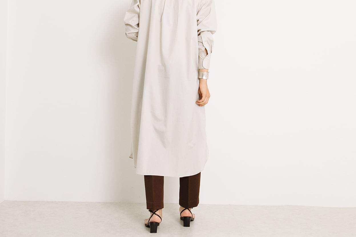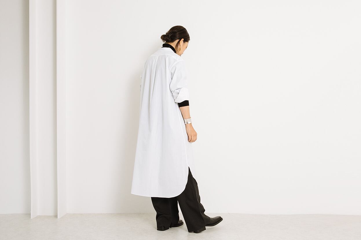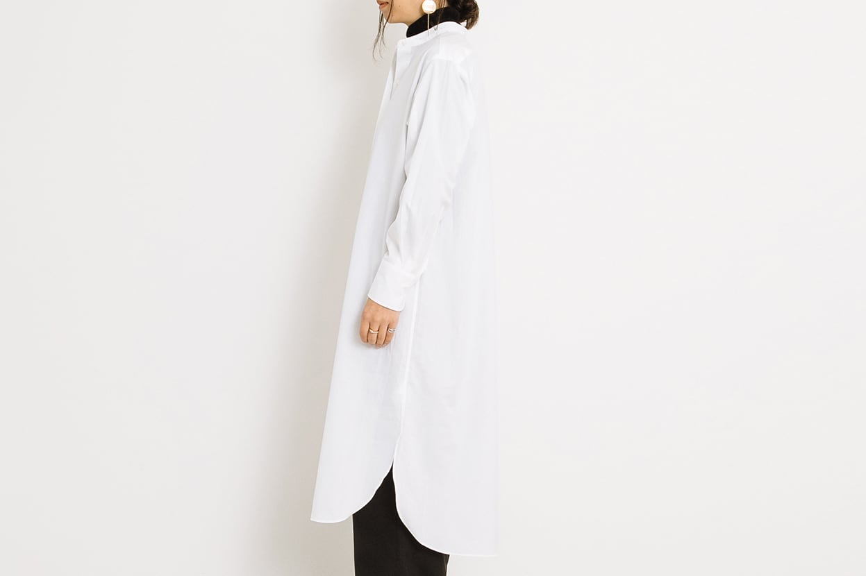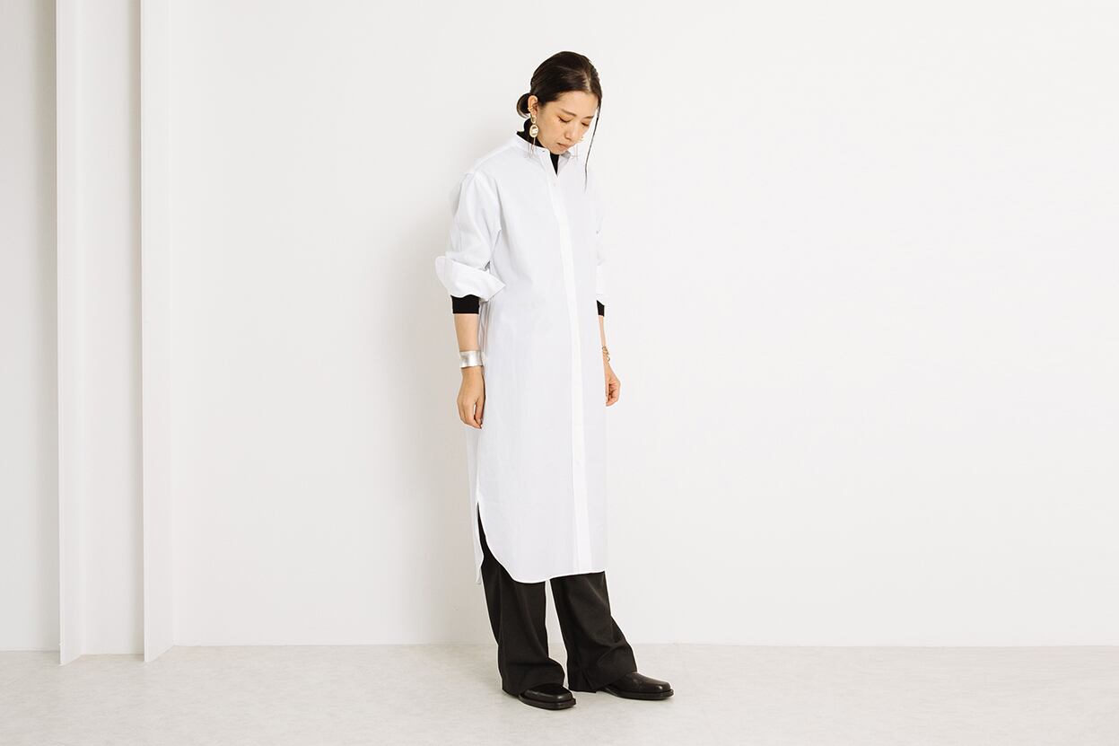 メンズのドレスシャツをそのまま丈を長くしたかのような、マニッシュな雰囲気のバンドカラーシャツワンピース。