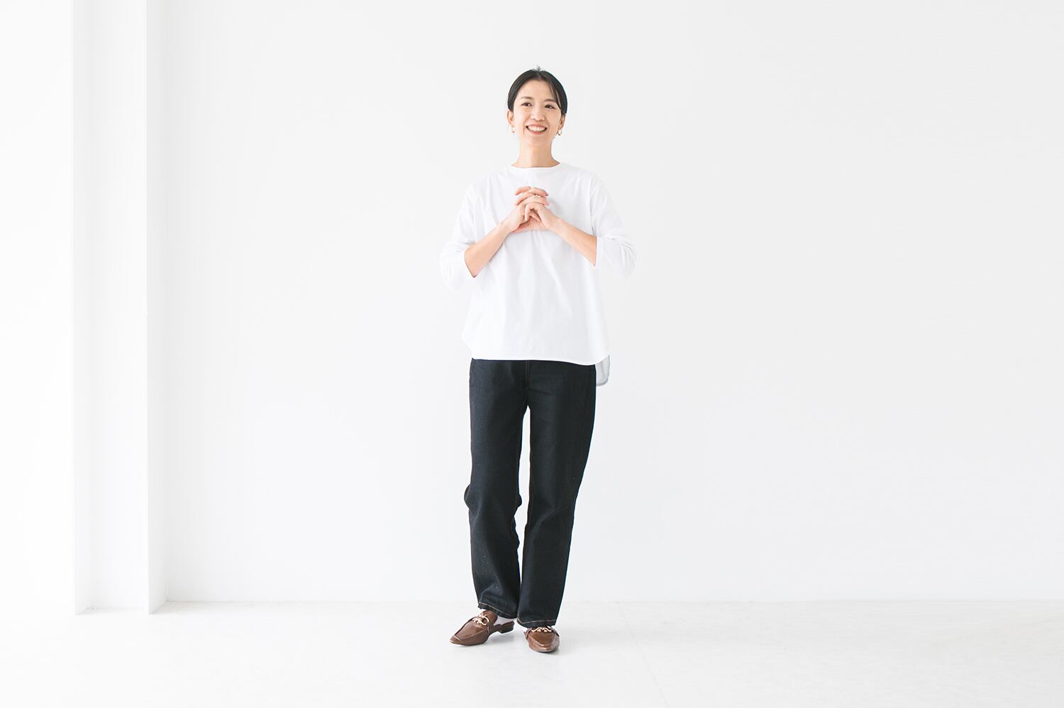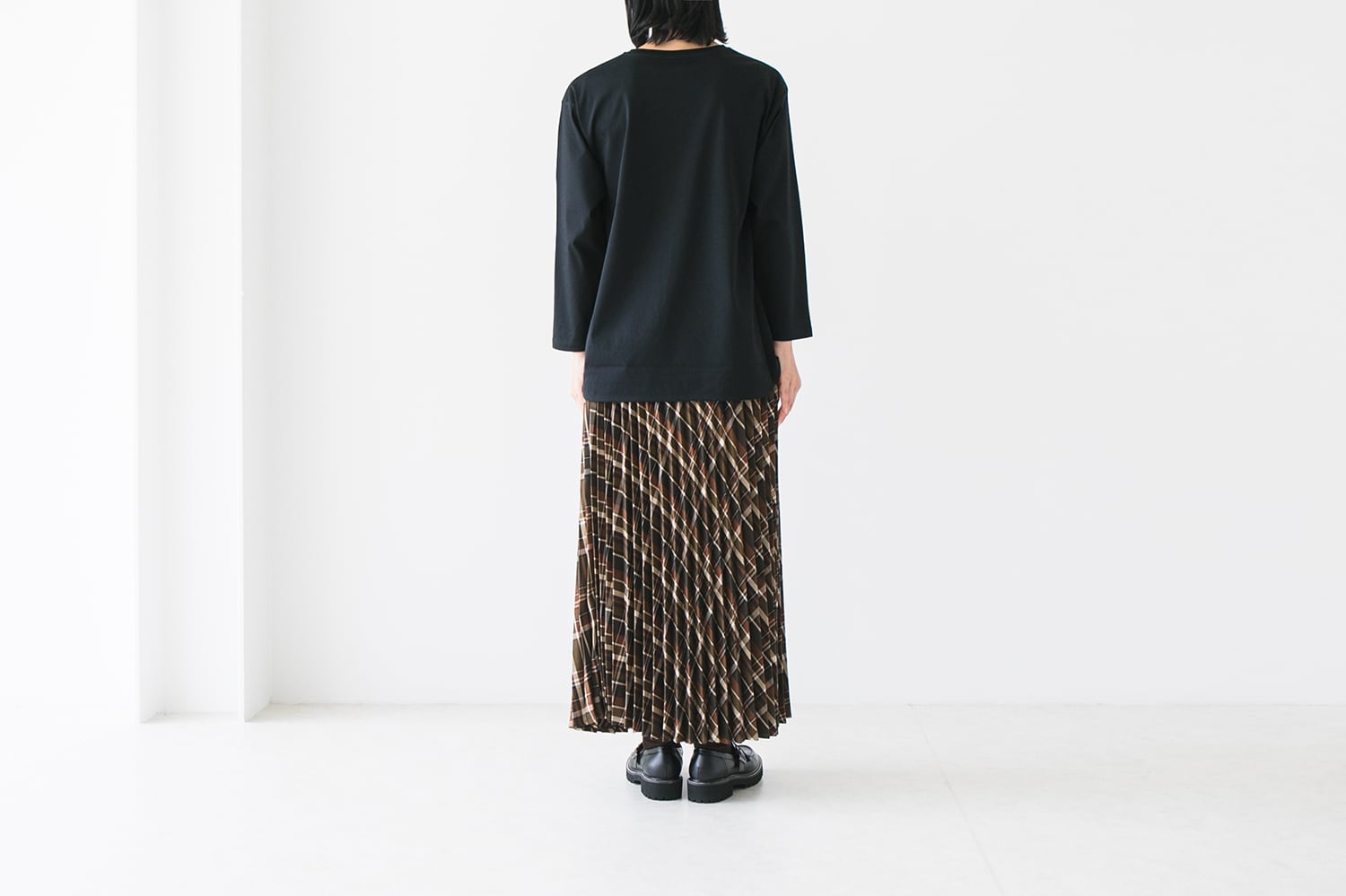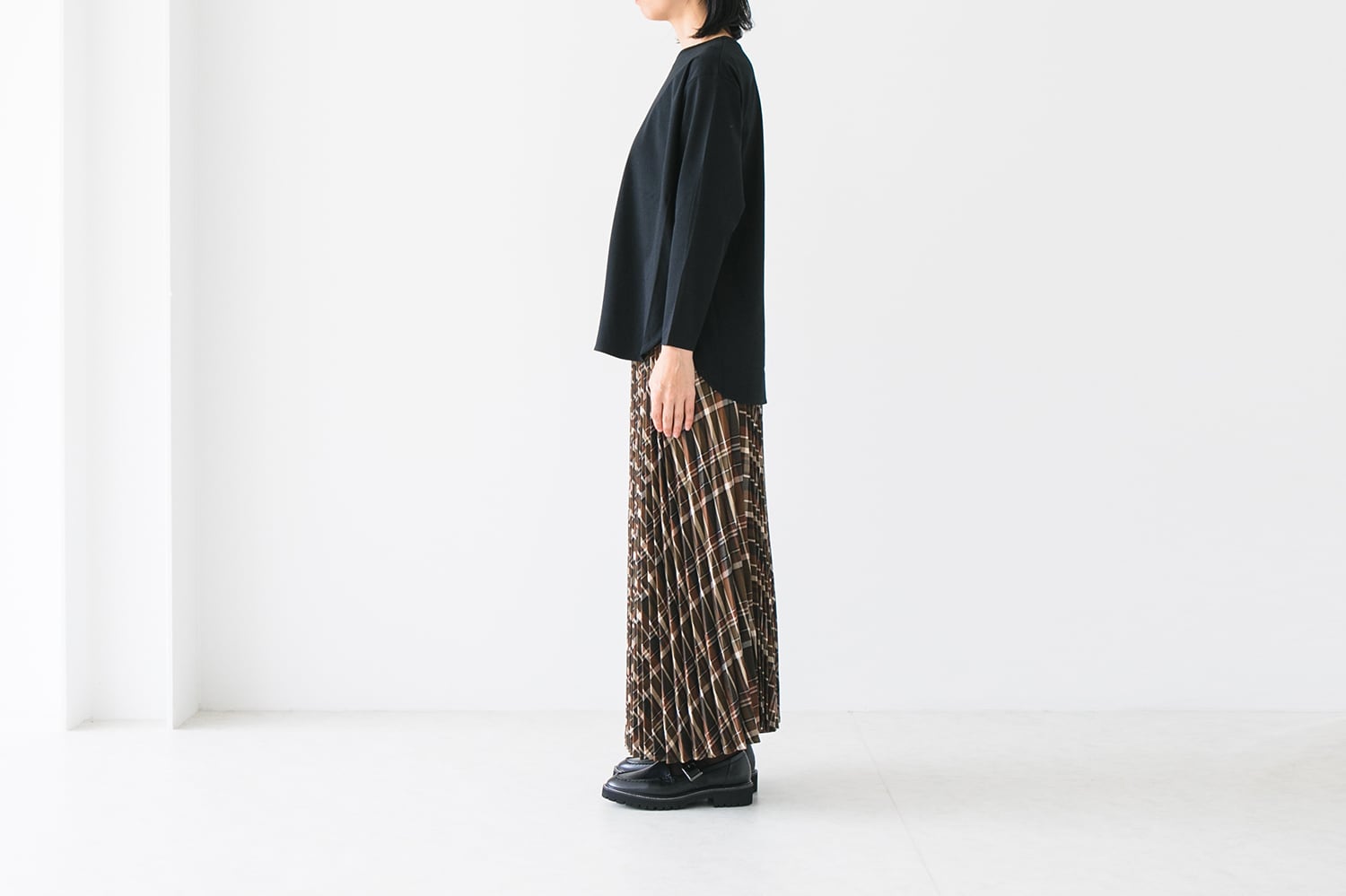ラウンドヘムデザインはボトムを選ばず、1枚でも様になるアイテムです。ショート丈のアイテムの下に着用してレイヤードスタイルも楽しんでいただけます。