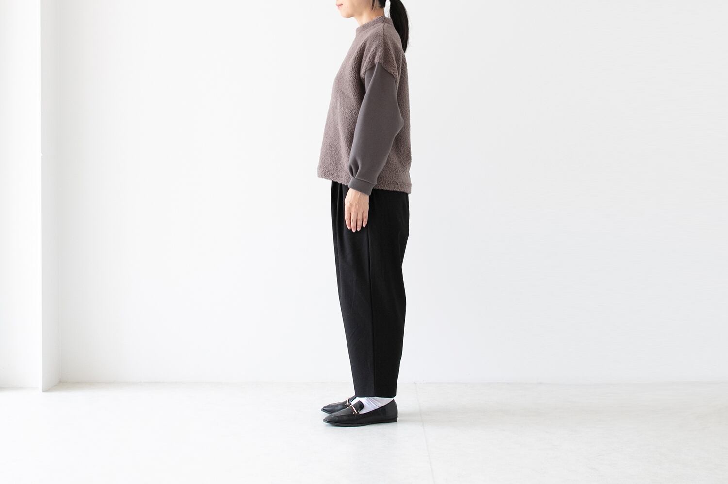 ふわふわのボアと袖の裏起毛スウェットのドッキングが可愛い1枚。衿元にはあえてリブを使用せず、ボアで作成しているのでカジュアルになりすぎず綺麗めなボトムとも合わせやすいです。